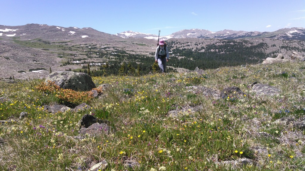 The storm was brief. The sun came out. We contemplated staying here for the night versus continuing on. Staying this far away from Cloud Peak wouldn’t set us up well for a summit the next day so eventually we pushed on, although by now it was near 4 pm.