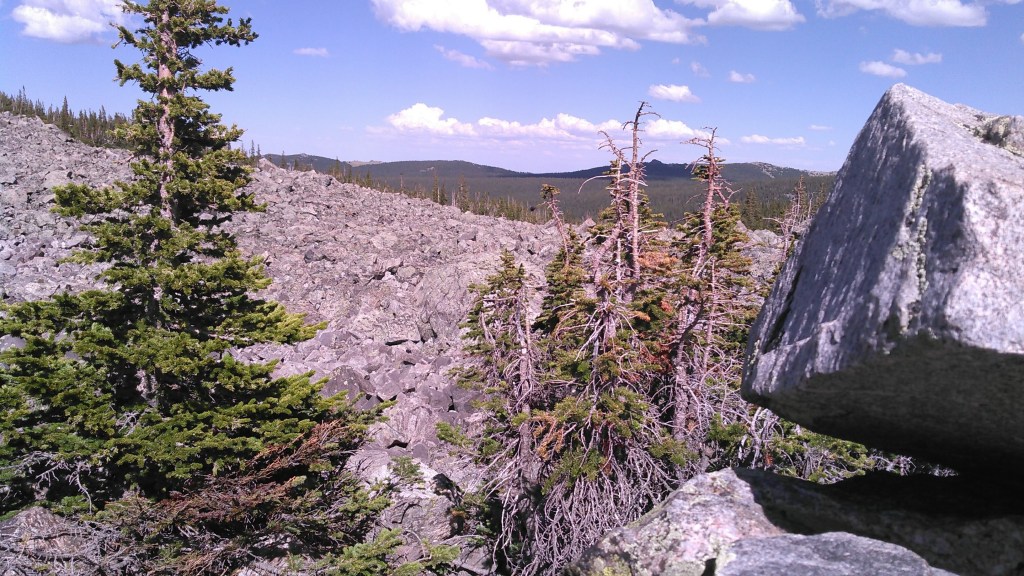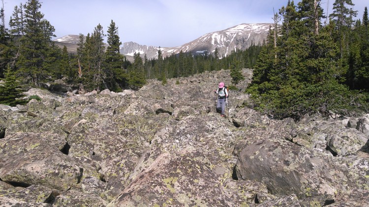 Finally we came out to a big boulder field that gradually climbed up. I thought for sure at the ridge we would be able to see South Piney Lake but instead there were only more boulders. I slowly made my way through until we got to some trees.