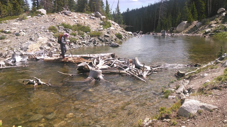 From here there were very good social trails that brought us to the dam embankment on the east side of the lake. We crossed South Piney Creek on some log bridges and then headed towards Elk Lake where we had decided to camp.