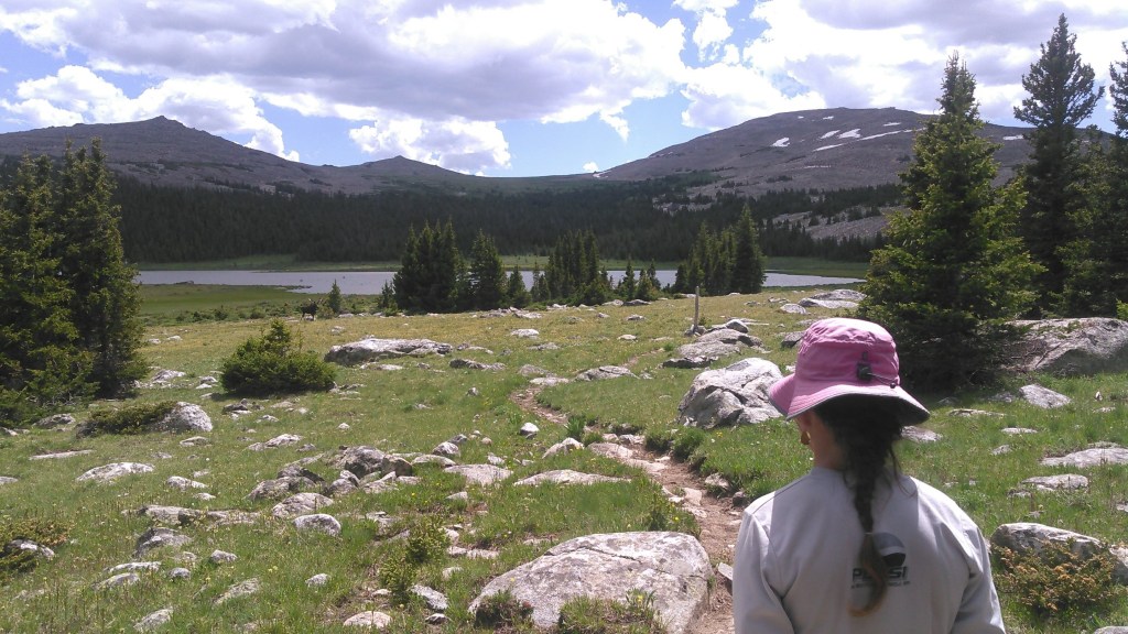 On the east side of Elk Lake, just across Elk Creek, there was a small ridge and some good camping behind. The view of the entire high peaks of the north Bighorns was unexpected. The only downside was the water coming through Elk Creek tasted bad and appeared to be full of algae. It was early afternoon. We set up camp and then debated on an afternoon side hike. Eventually we decided to head up the Solitude Trail towards Ant Hill Pass with the intention of climbing the bump just to the west of there. Before we headed out we watched a moose walk up the Elk Creek. We encountered him on trail and had a brief stand-off, albeit from around 100 meters. Once we were above tree-line hiking to the pass, we watched the moose walk across the lake.