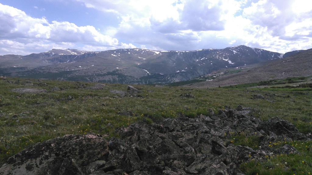Eventually up on the divide the grass gave way to boulder fields. I set my sights on getting to the very top of an 11,700 foot bump. We got close but there were a ton of boulders and the wind was so strong and I was so cold as it was around 40 degrees, I gave up 20 horizontal feet and about 1 vertical foot from the top. I hastily took a couple photos of the view and then we descended to a sunny spot out of the wind to eat a snack.