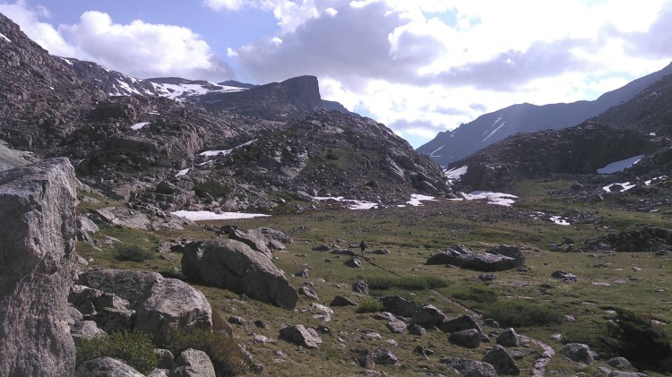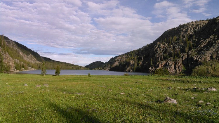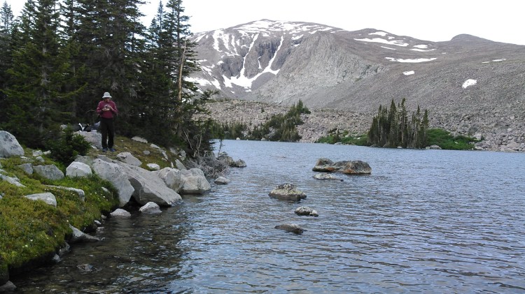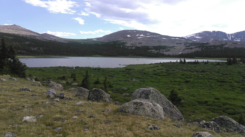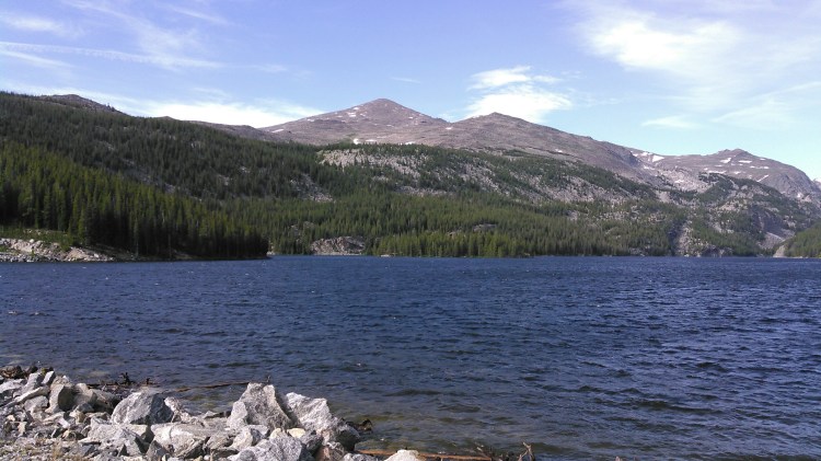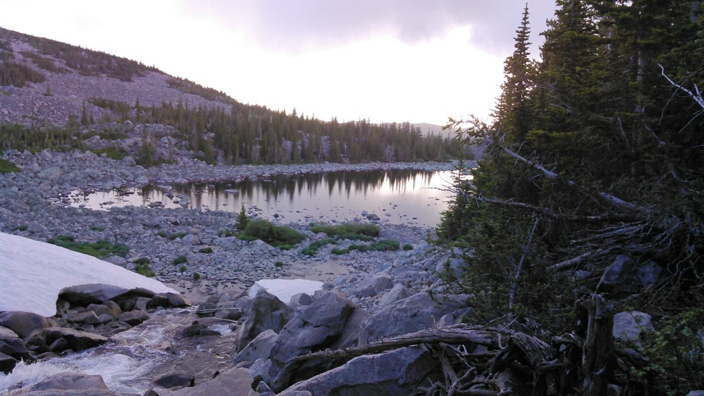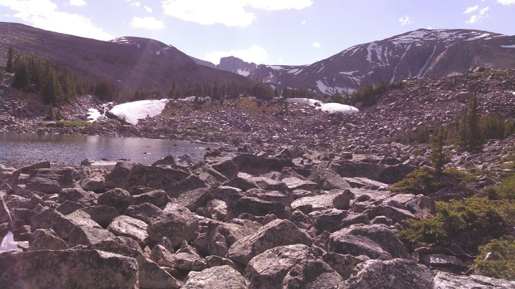 So we spent most of the morning going through boulder fields and bushwacking until we came to a campsite on the north side of Cloud Peak Reservoir two thirds of the way to the east edge.