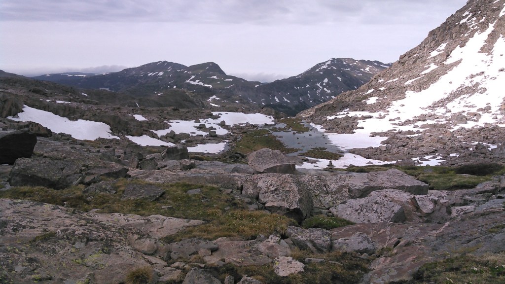 After a snack break we kept heading up. Now we were on boulder field. We climbed towards the ridge as opposed to going up the shallow gully. I’m terrible on boulders and was moving slowly. Erik suggested we try hiking up a snow patch on the gully and he ventured onto the snow and immediately started post-holing. Obviously the snow wasn’t going to be faster. We could look up towards the summit which was mostly shroud in clouds- go figure, Cloud Peak in the clouds. The weather was cold and the wind was howling. It was already getting late in the morning. We had already decided to bail on the route down to Middle Cloud Peak Lake but now we were thinking about bailing on Cloud Peak, too. We had started too late and the summit was cloud covered. We still had at least a third of the way to go of the off-trail portion and it looked to be all boulder field. So we gave up and headed back down.