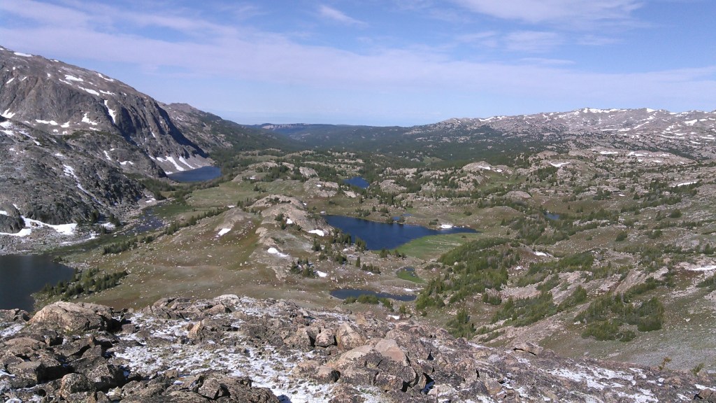 On the way down I found a grassy slope that I really wanted to go up. So I convinced Erik and we made it to a sub-peak. It provided a 180 degree intimate view of the big north Bighorn mountains. It was similar to our campsite, but we were up higher and closer. From this vantage, we could also see that this valley had a grassy slope leading up to the pass with the Powell Lakes…perhaps a route for a next trip!