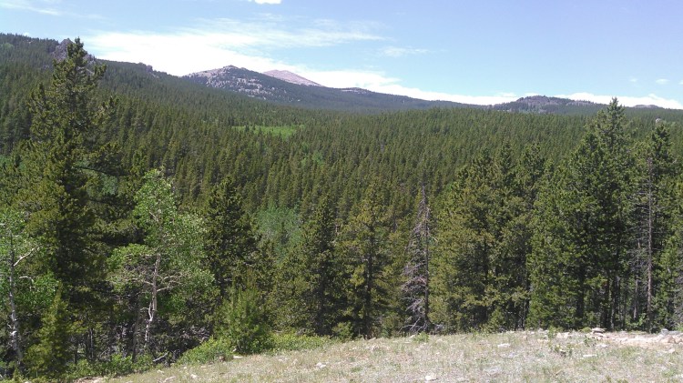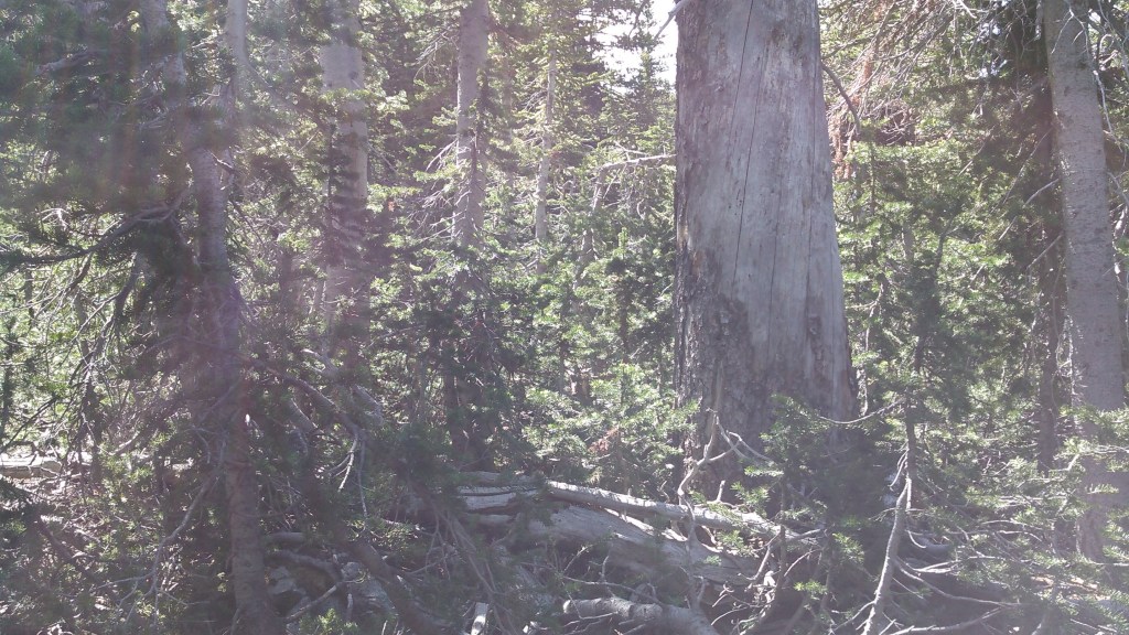 From here we started climbing up the ridge on Tut’s Cutoff trail. There were a few pesky mosquitoes. We came to a nice meadow with a view of Penrose Peak. From here we had the option of either taking a trail down to the valley to re-join the Solitude Trail near Willow Park Reservoir, take a trail marked on only one of several maps that cut across the base of Penrose Peak, or begin an off-trail adventure. It was way too late in the day to attempt Penrose Peak. This meadow would have made an excellent camping place, but it was hardly noon, so I proposed an off-trail medium-high route along the eastern slopes of Penrose Peak. We walked across the beautiful meadow and then headed into the forest. At least somewhat recently there had been free-range cattle in this area and so there were paths everywhere through the woods. This area was also relatively flat. We headed mostly south and gradually up.