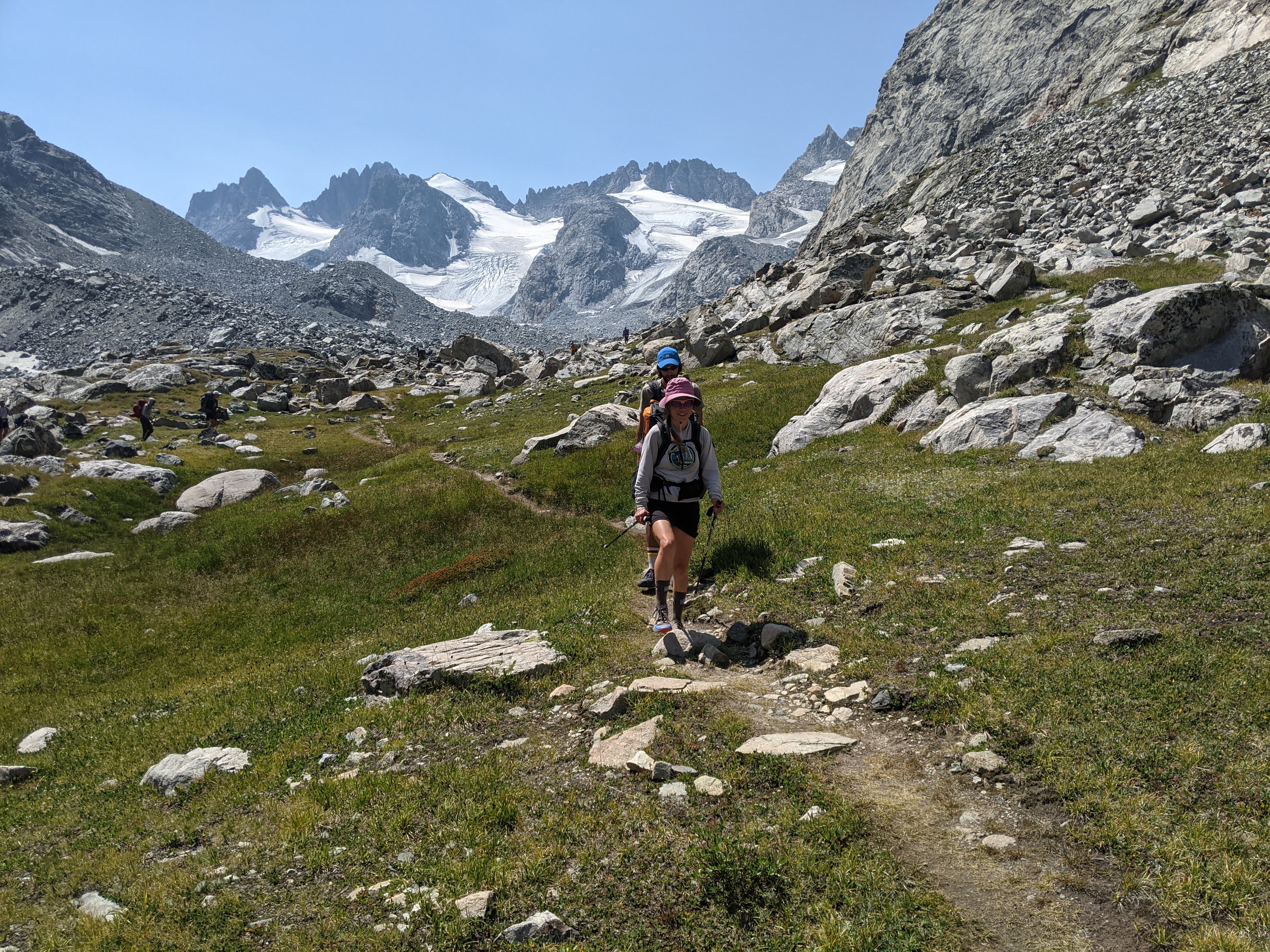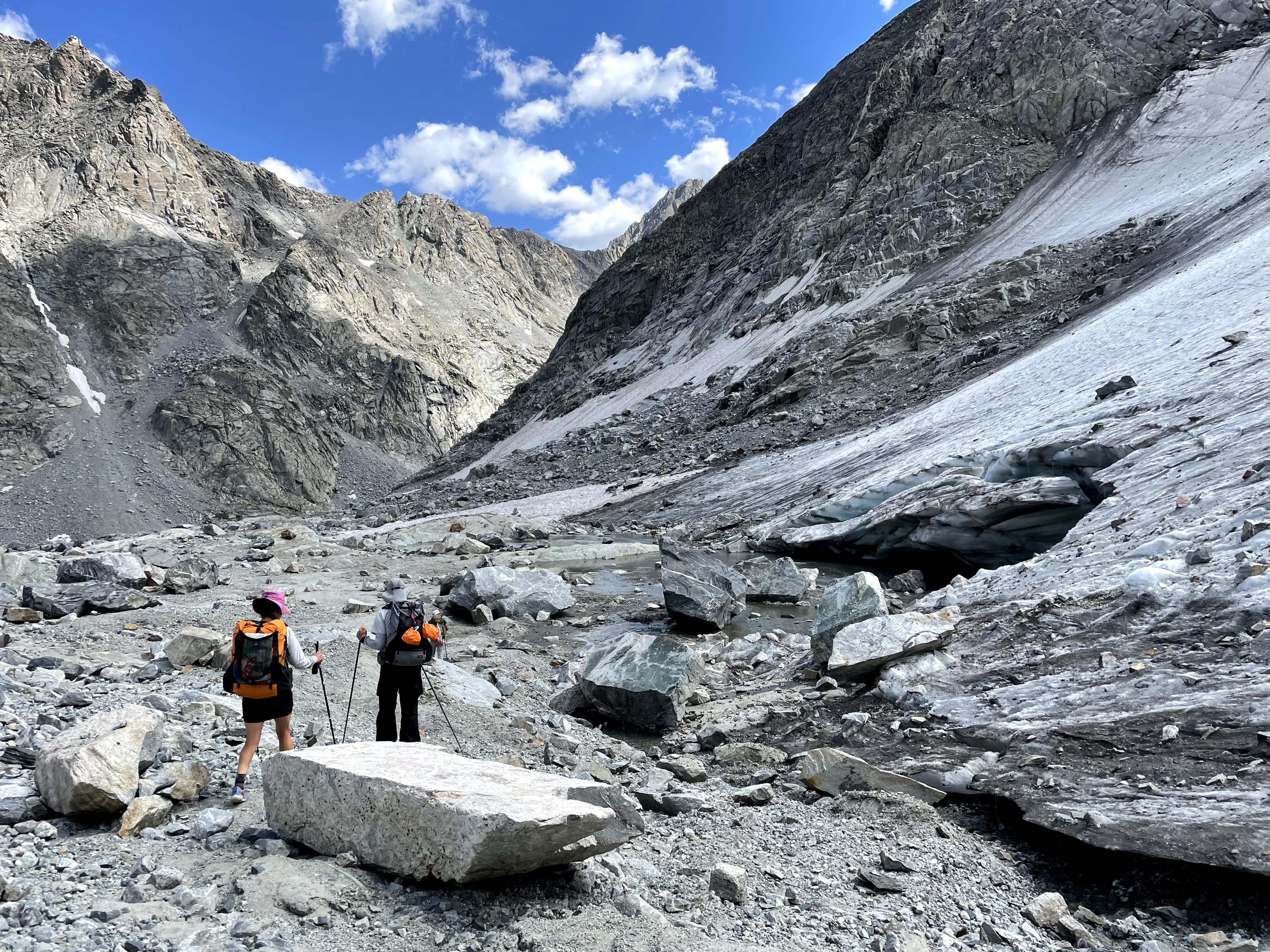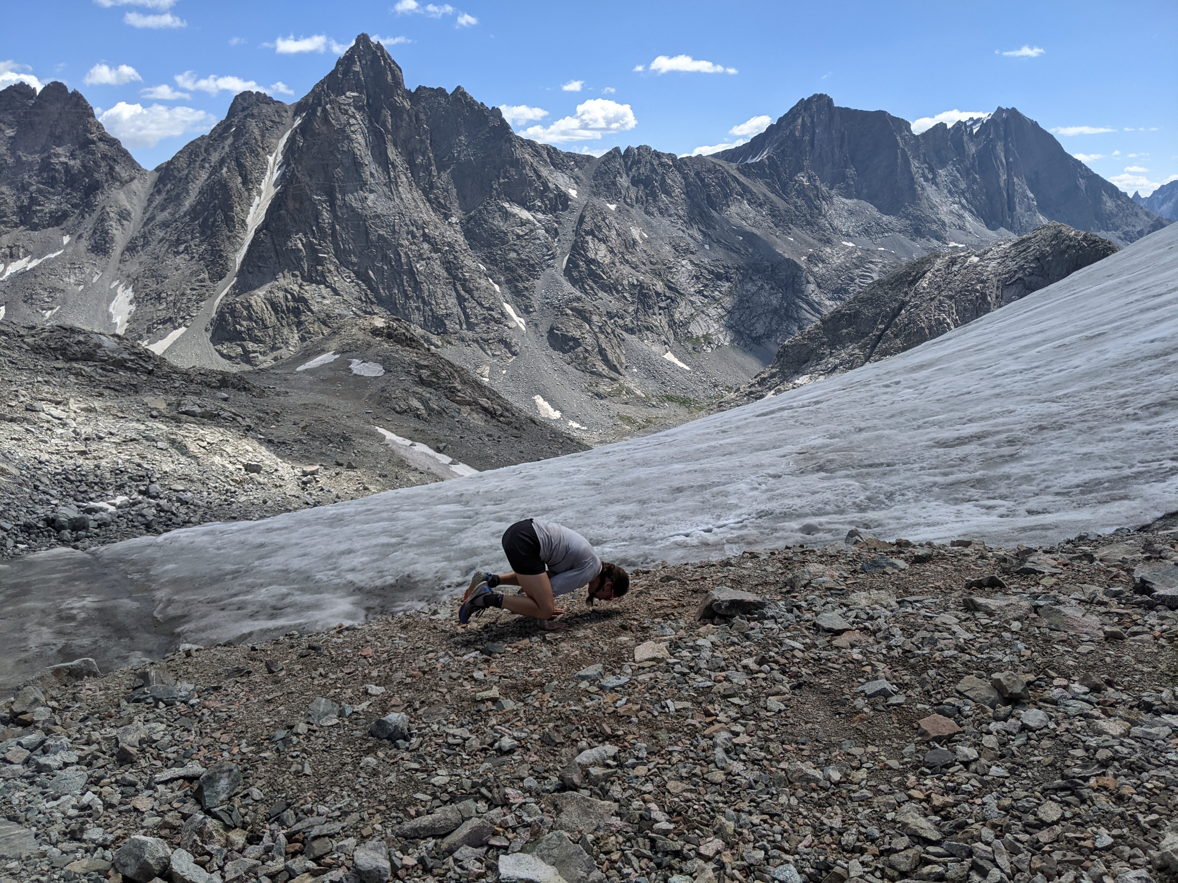 At this point I was pretty angry about my poor down-climbing skills and our lack of glacier travel on the trip despite hauling some glacier gear (harnesses, rope, and crampons/microspikes) and so I declared we go climb up the Twins Glacier to a different pass to get a look at Summer Ice Lake. I took off in that direction, walking on the glacial silt from the mostly melted Twins Glacier- a combo of sand and small rocks. We were still heading downhill but the angle wasn’t very steep so I didn’t mind the sliding.