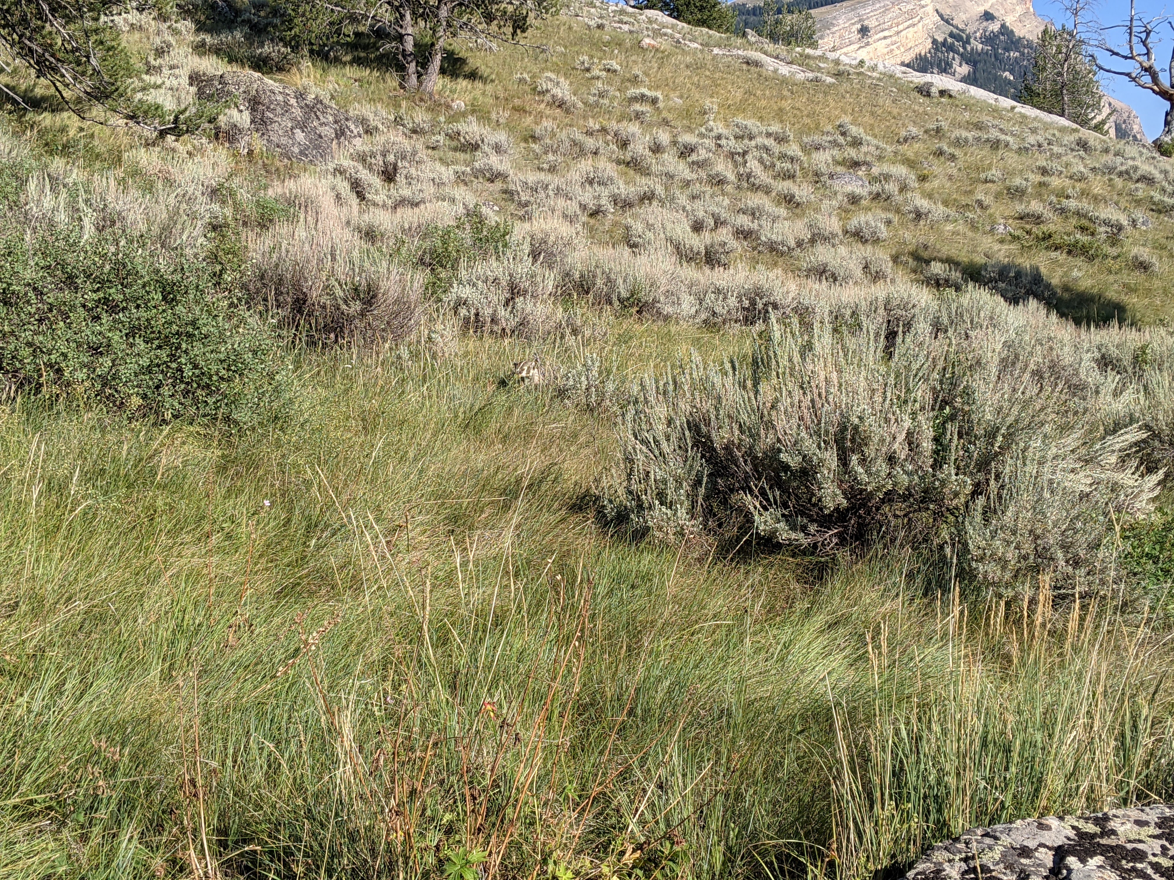 Well, first we crossed a meadow, then we started bushwacking up to the boulder field. Once we hit the boulderfield, we mostly started going up. I knew this wasn’t the best plan, but going up is just so easy. I was concerned that while our vertical progress was good, our horizontal progress was abysmal. We had started going up on the face of the mountain that rises up from the valley.