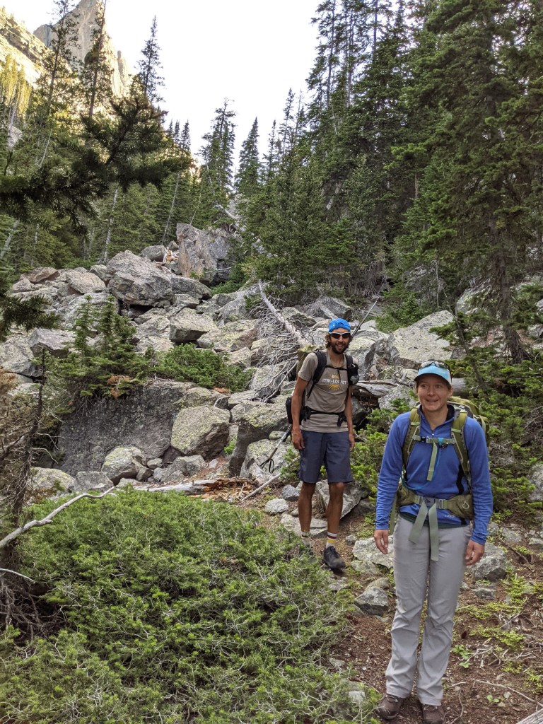 At the flat area on the river above the lower waterfall, we lost the trail. We debated crossing over to the north side of the creek but we couldn’t decipher an obvious trail and since we needed to be on the south side of the creek anyway, we elected to not cross. After a short boulderfield section, we were able to head back into the trees and make progress for a bit longer before we officially lost the trail. From here we alternated boulder fields with forest, initially an aspen forest and then near the base of the mountain a pine forest.