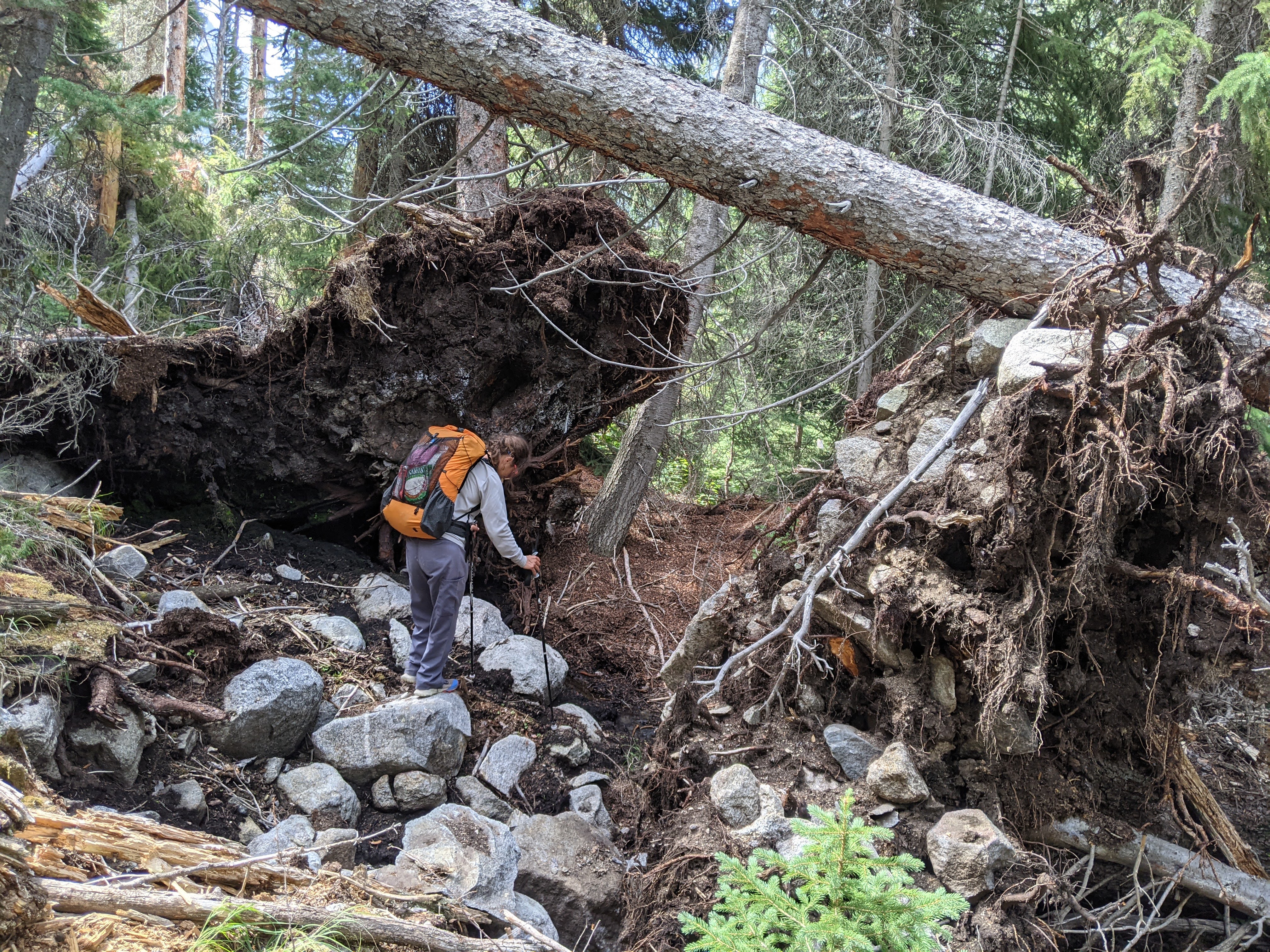 Once down at Alexander Park we scouted for the nonmaintained Roaring Fork Trail. We got onto this just after it crossed the creek but we quickly lost it again amidst huge piles of blowdowns that became the theme for the next couple hours. We stayed on the north side of the creek even though our map showed the trail crossed to the south side and then just when we came out onto our first boulderfield, the trail picked up again. The trail was really nice through the boulderfield but once back in the trees there were a ton of blowdowns. It was a couple long miles frequently detouring blowdowns until we go to the CDT/Highline.