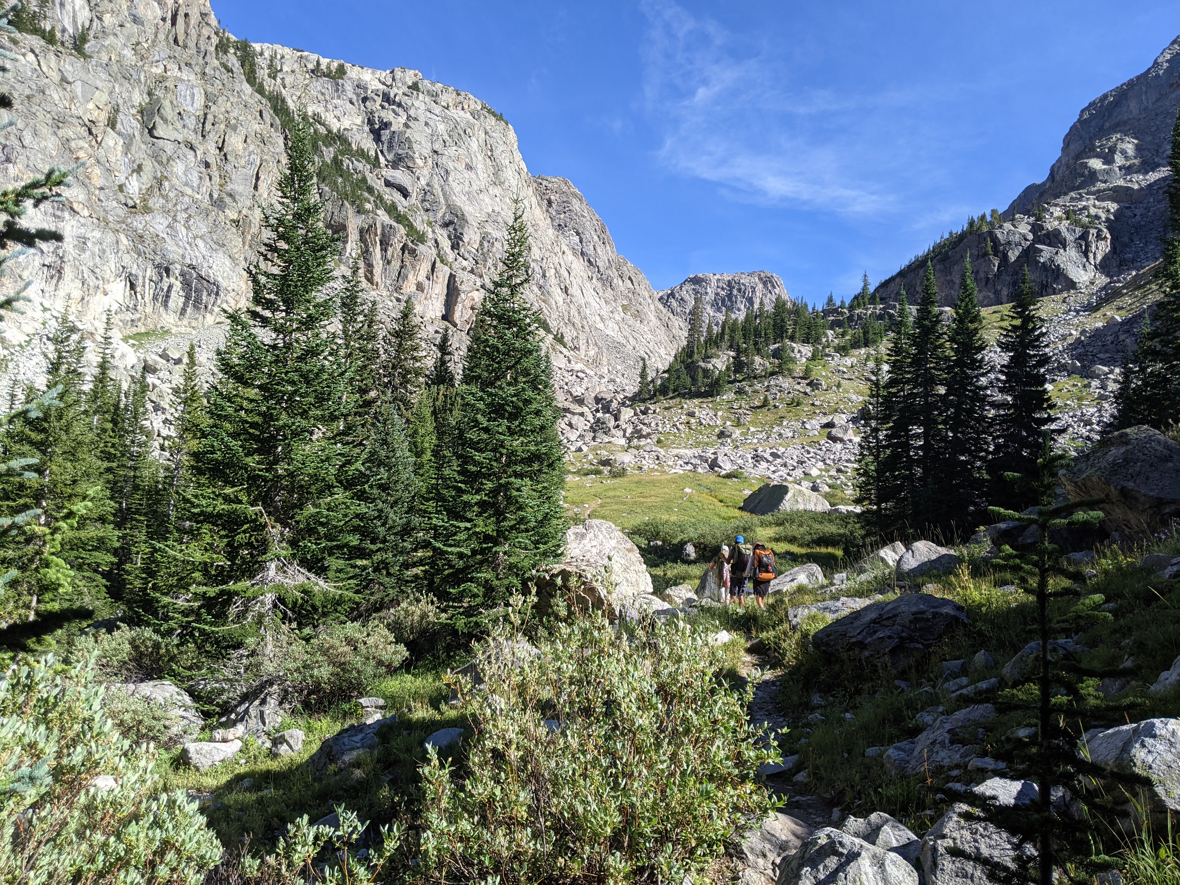 “Guys, we have to go take the Baby Route!” Eva exclaimed when the baby party had just climbed out of sight. So we bouldered across the creek to where there was some grass on the edge of the boulderfield and then began ascending.