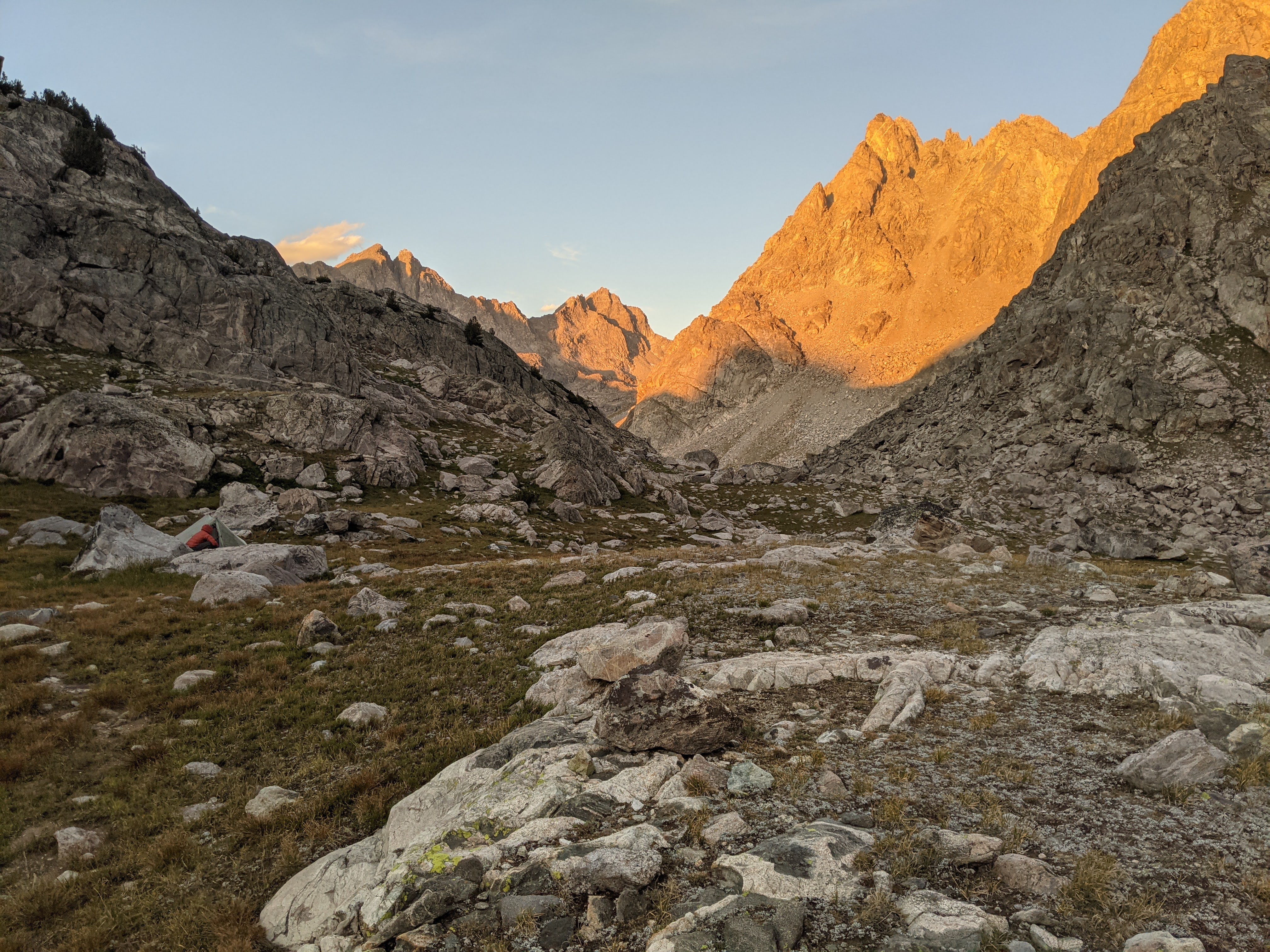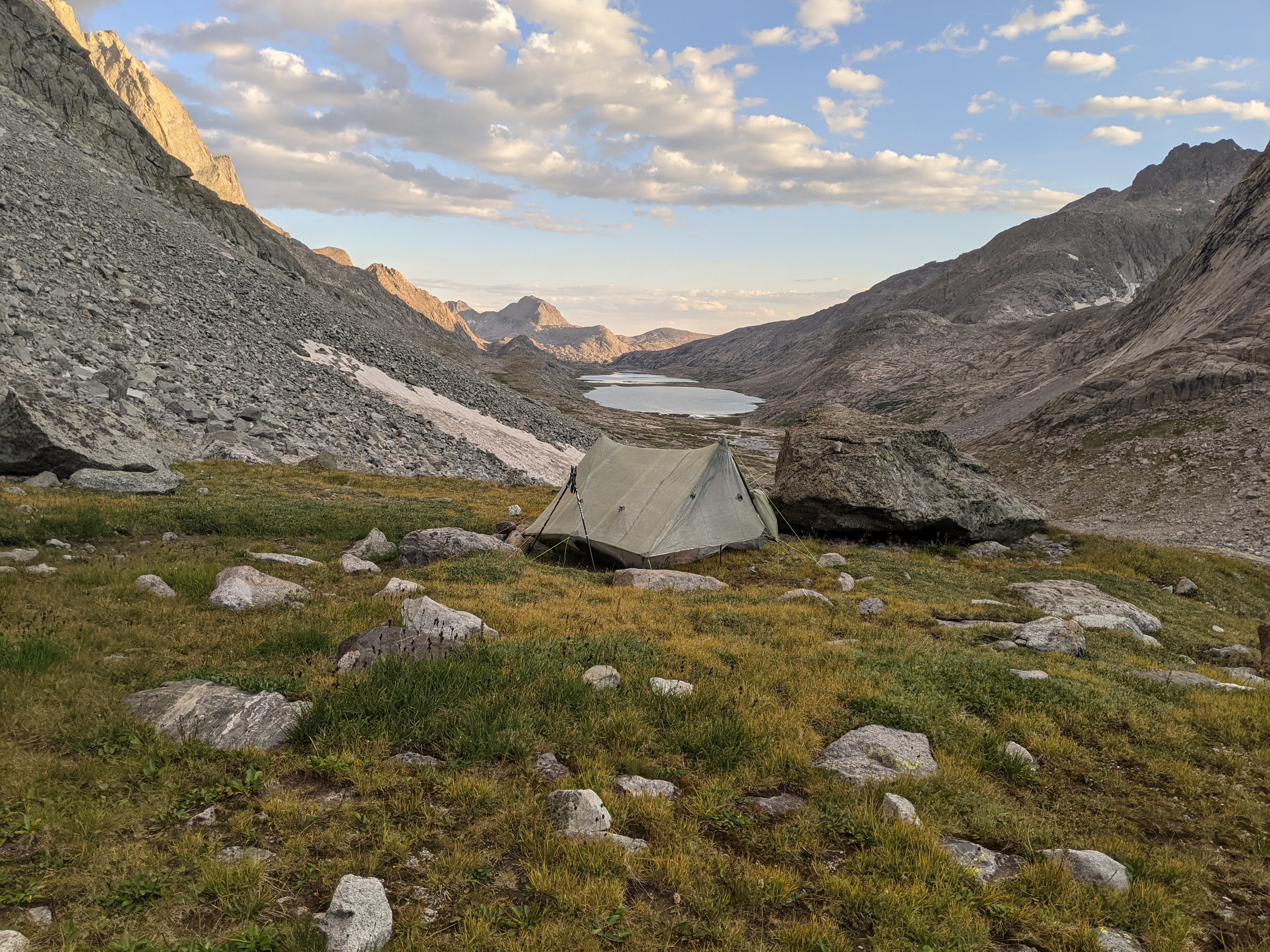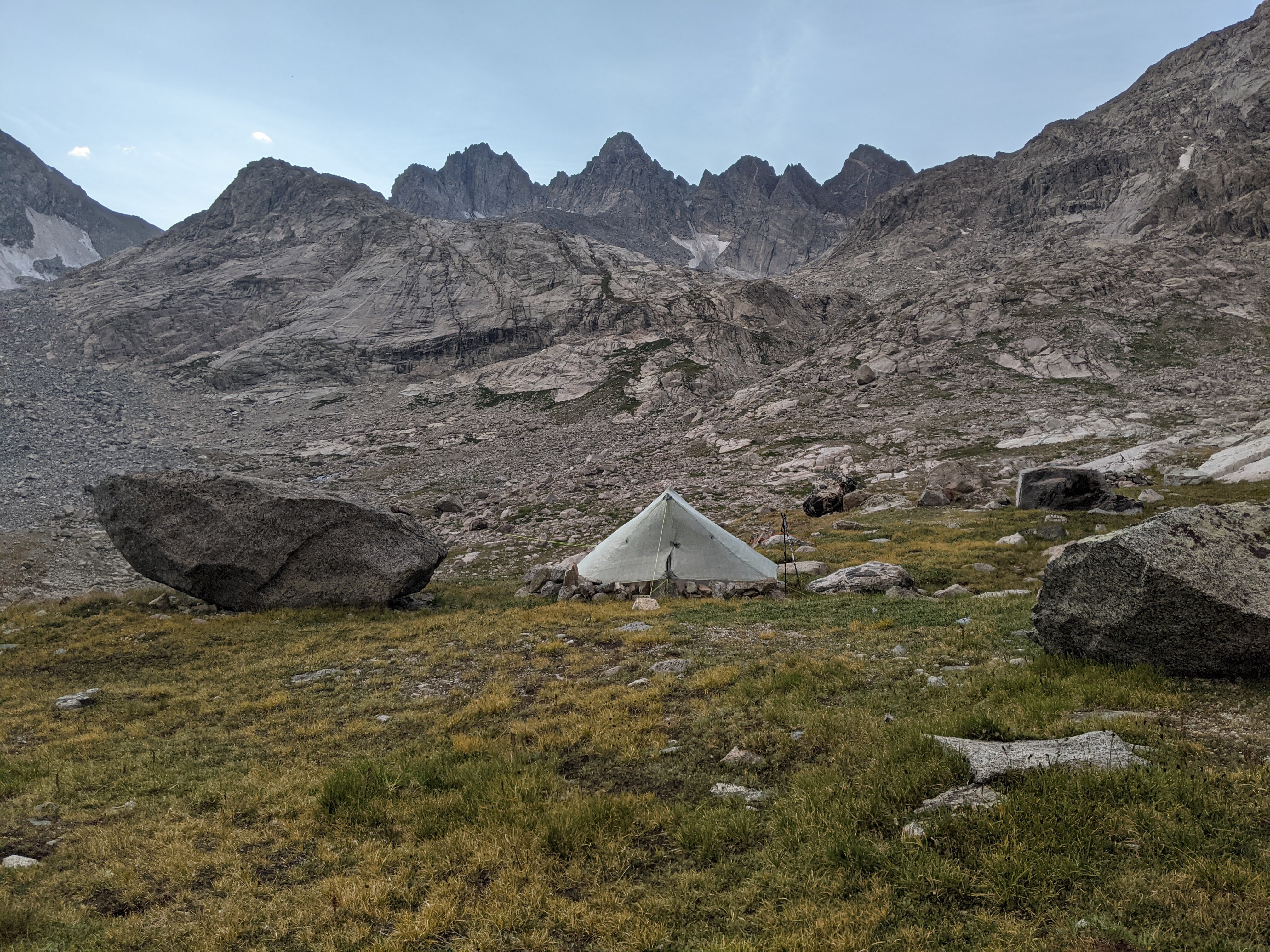 They told us there were some more campsites a short ways on and we headed there. At the top of the waterfall leaving the small lake we found a couple open areas good for camping. In general we were fairly demoralized between 5 hours of boulderfield and getting crushed by the baby party, so we decided to camp for the day. It was pushing 6 pm. Our bid for Gannett now seemed over as Gannett was the halfway point of our trip and if we got behind schedule it would make for a very miserable last three days. Tourist Creek had taken a solid two hours longer than I’d hoped for and we still had another four miles or so to Gannet.