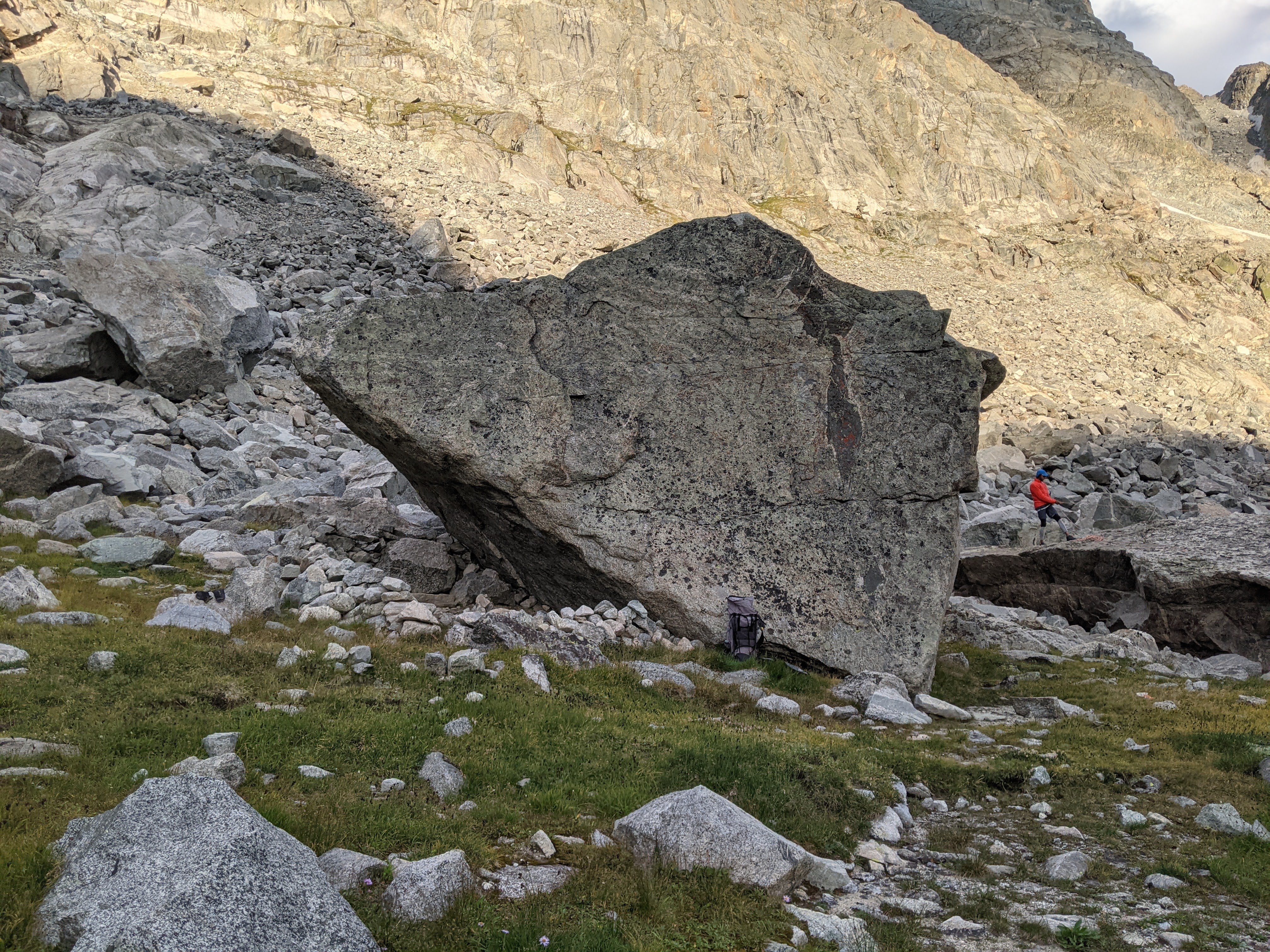 Next we began looking for a campsite in the upper Titcomb Basin. Mostly we were amongst rocks but we scouted a few grassy areas and went to check them out. After crossing both rivers, we found a small but reasonable grassy area big enough for two tent pads. There was a spot farther down the valley Erik really wanted to see and another one higher up that Craig had been eyeing. Meanwhile Eva and I stayed put. Craig returned saying his spot was well-established and even included a wind protected “kitchen” behind a giant boulder. It didn’t matter what Erik found- his site was too wet anyway- we moved up to Craig’s. It was a nice grassy area with the best campsite view of our trip, and there were lots of contenders! The only downside to the site was the water access which was a decent ways away over some small boulders but worth it for the view.