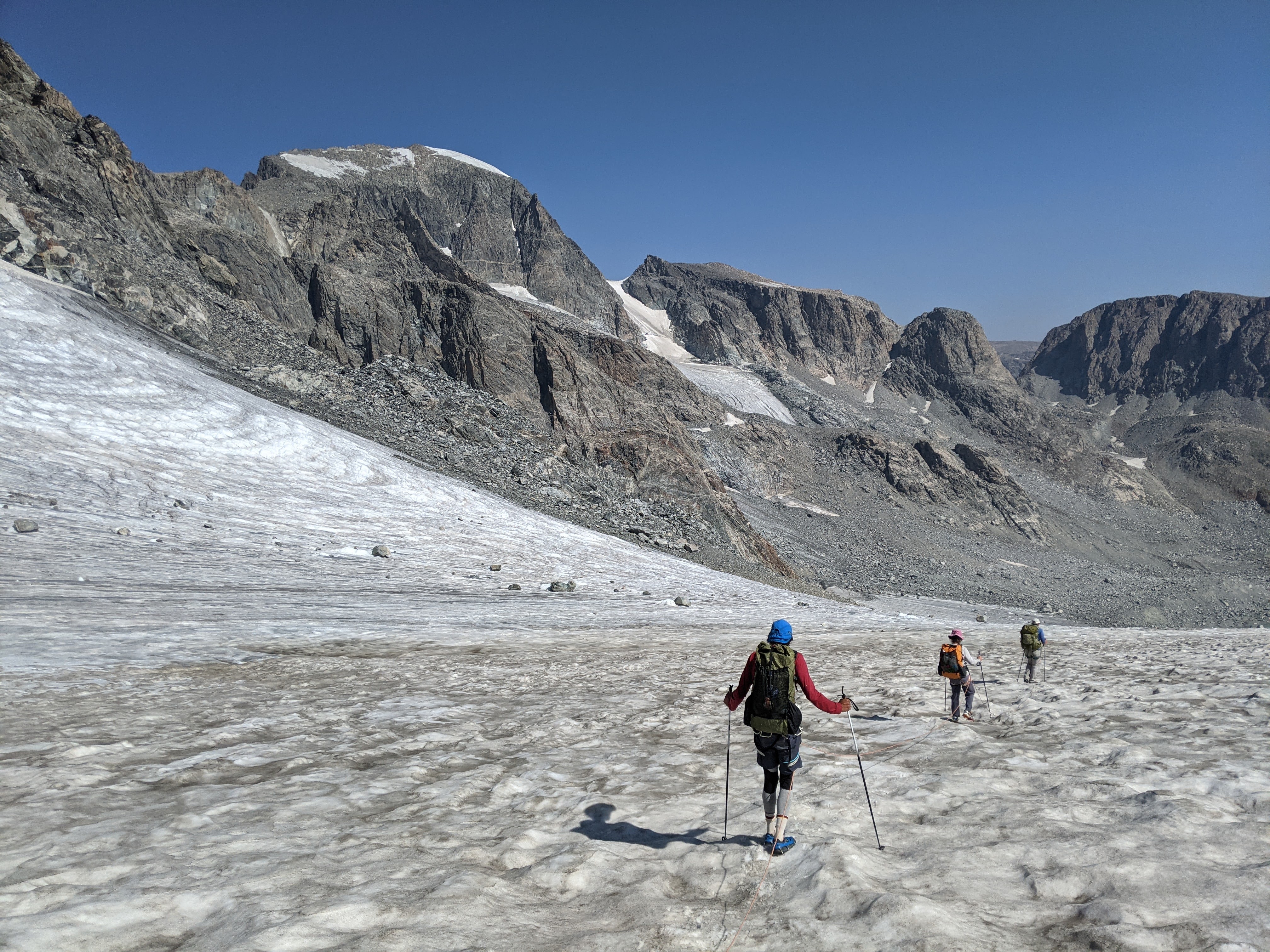 From here we could see most of the Dinwoody Glacier whose shape I would describe as a hand, only the entire palm was melted. Owing to a low snow year and climate change, I couldn’t help but think we were seeing this glacier at its lowest volume, at least since the last ice age. We got off the glacier much before our map indicated we would and as we continued on, this meant more boulderfield.