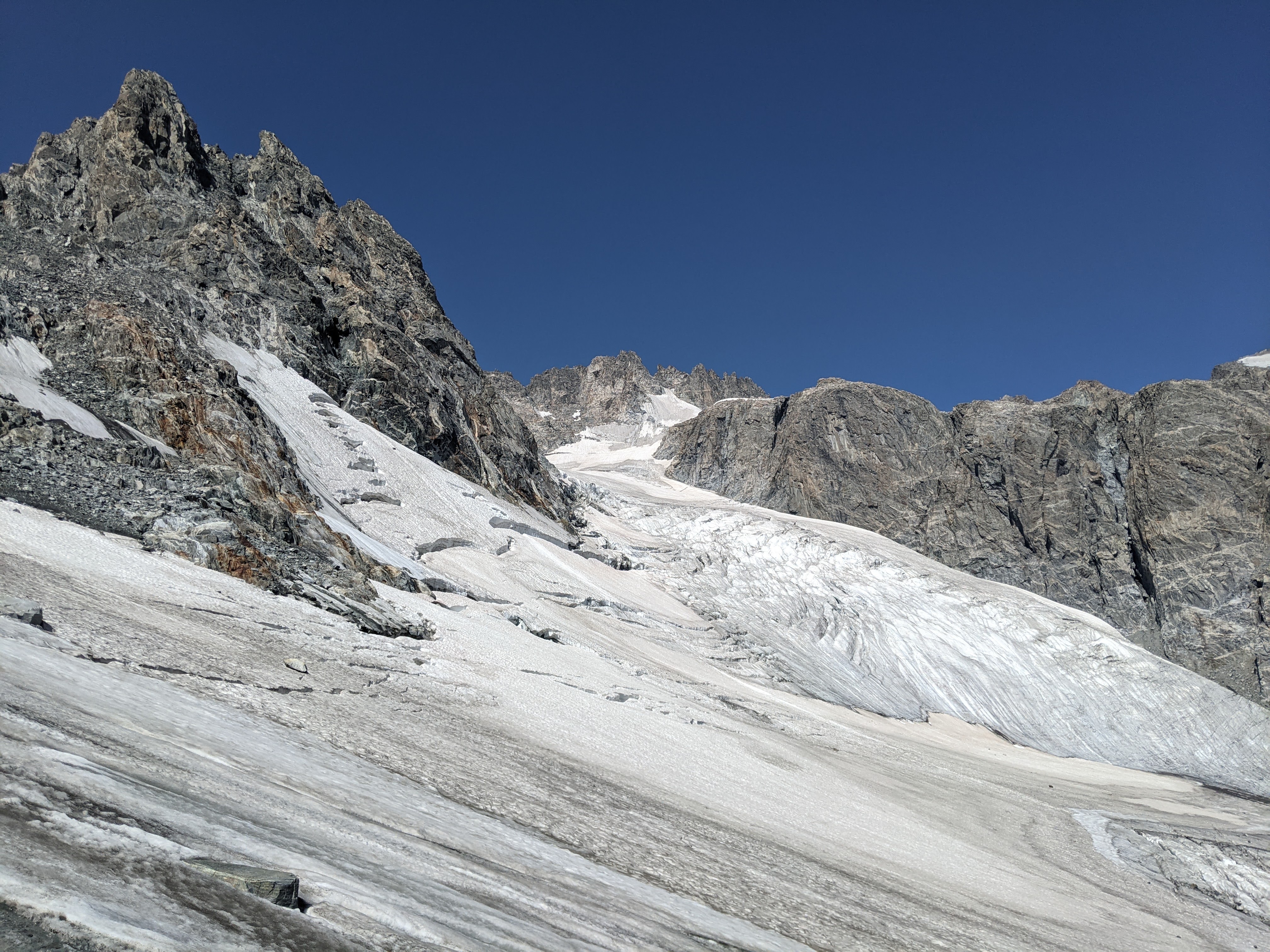 The others were quite a ways behind me- finally some terrain I could move fast in- and so I stopped to wait for them. When Erik caught up to me he said he didn’t want to climb on the rock-strewn crevassed glacier. He finally convinced me it was a bad idea and I reluctantly gave up on it.