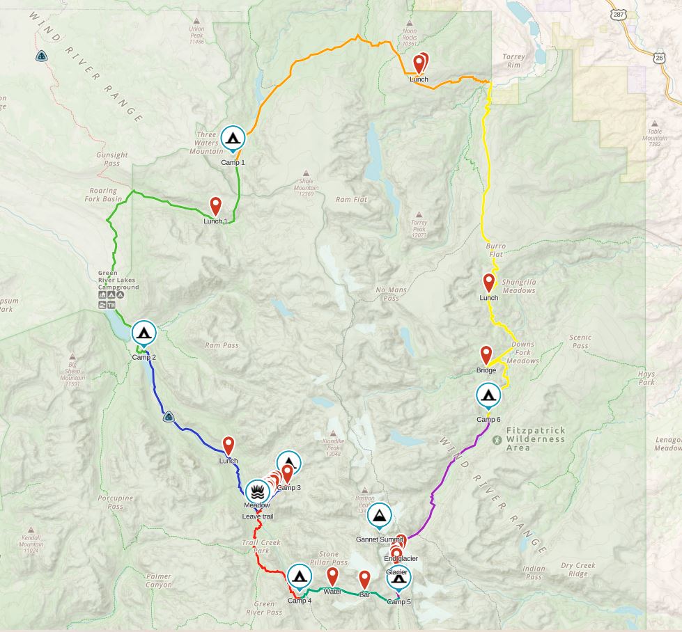 The route below, with each day a different color, began on the Whiskey Mountain Trail and ended on the Old Glacial Trail seven days later. And of course, because I’m a state high-pointer, we attempted a spur route up Tourist Creek and the northwest face of Gannet, Wyoming’s highest point.