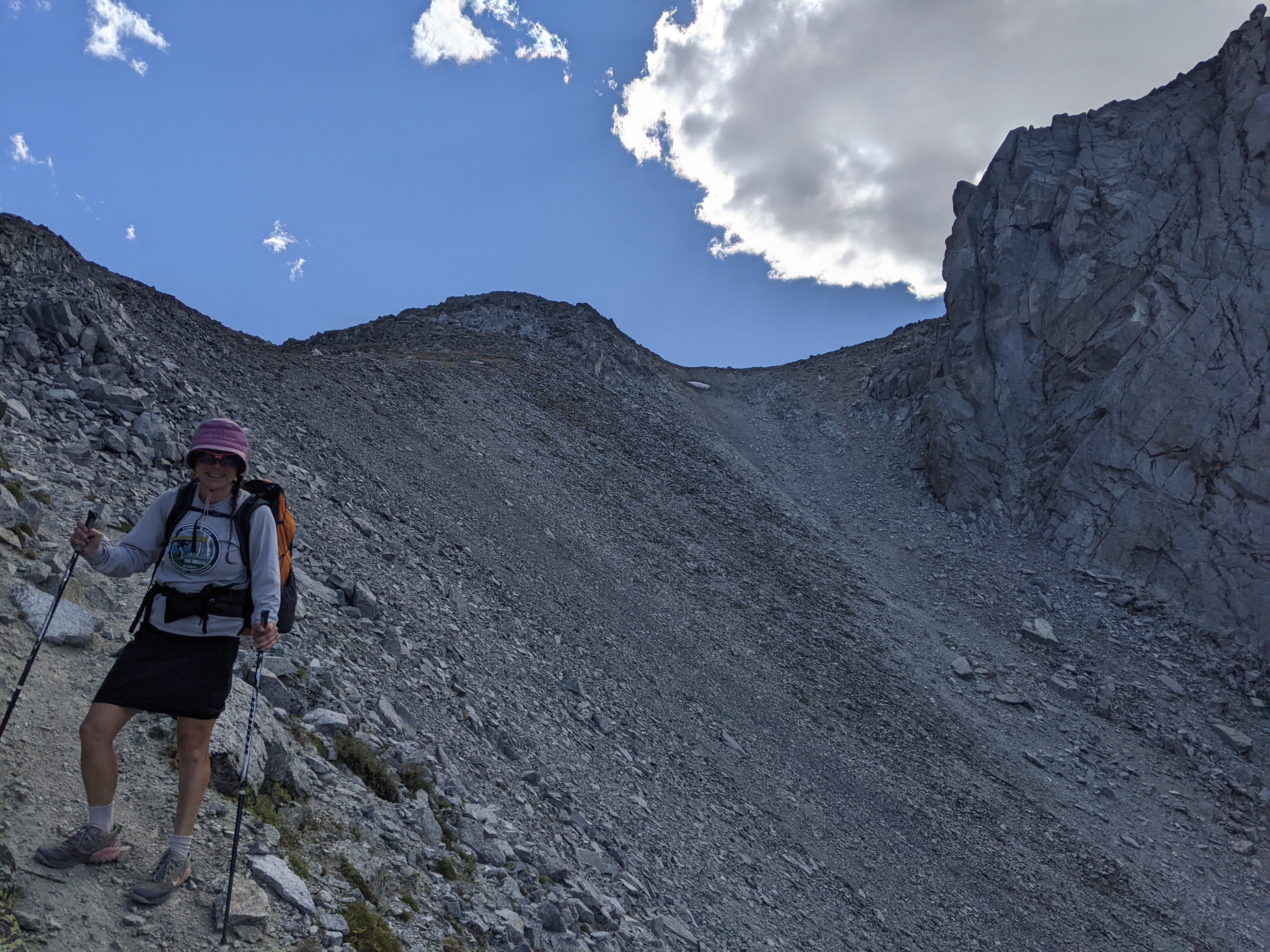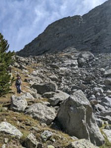 Me descending the steep north side of Hailey Pass. We had hiked up onto the bump just to the right of my head earlier in what I’m calling Pyramid/Hooker Pass.