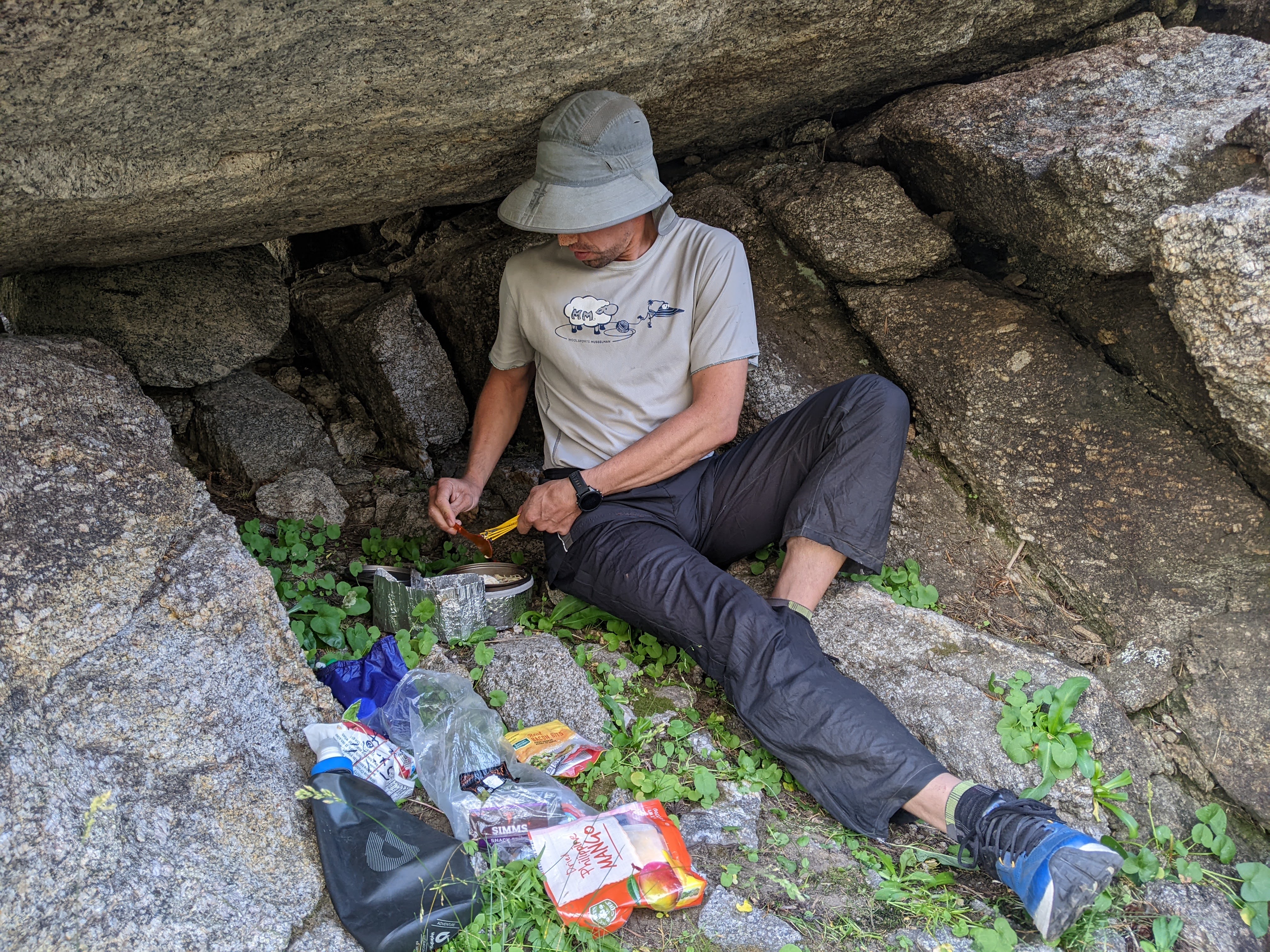 Erik cooked in this “cave,” a rock overhang, where the alcohol stove would be mostly out of the wind.