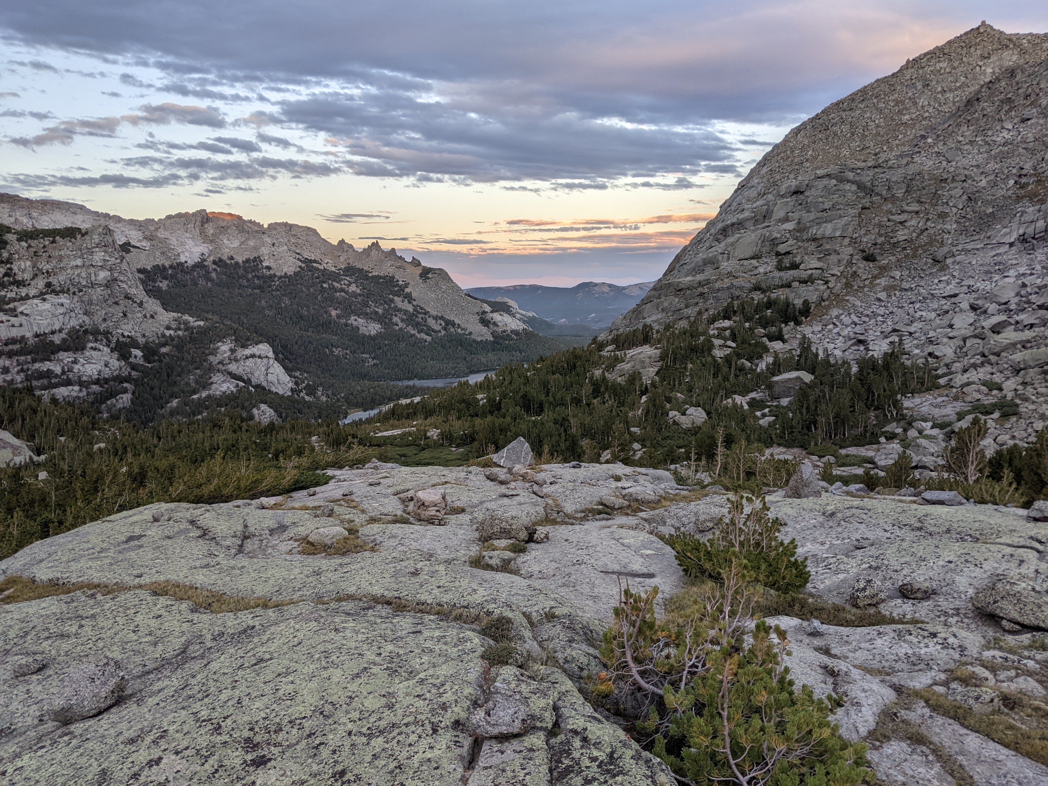 In the evening we still had enough time and energy for a hike. I really wanted to get up to see Upper Cathedral Lake. I naively believed we could see this from the closest rock slab. Some bushes, a couple creek crossings, and gaining the highest rock slab later, we still couldn’t see the lake. Perhaps had we hiked off this rock slab, waded through some bushes and hiked up the next rock slab we would’ve been able to see the lake, but by now it was starting to get dark. We took a different way to get back to camp that involved some boulderfields and then when we missed our alpine sidewalk back to camp, so bouldered off a couple cliffs. Just a little evening hike:)