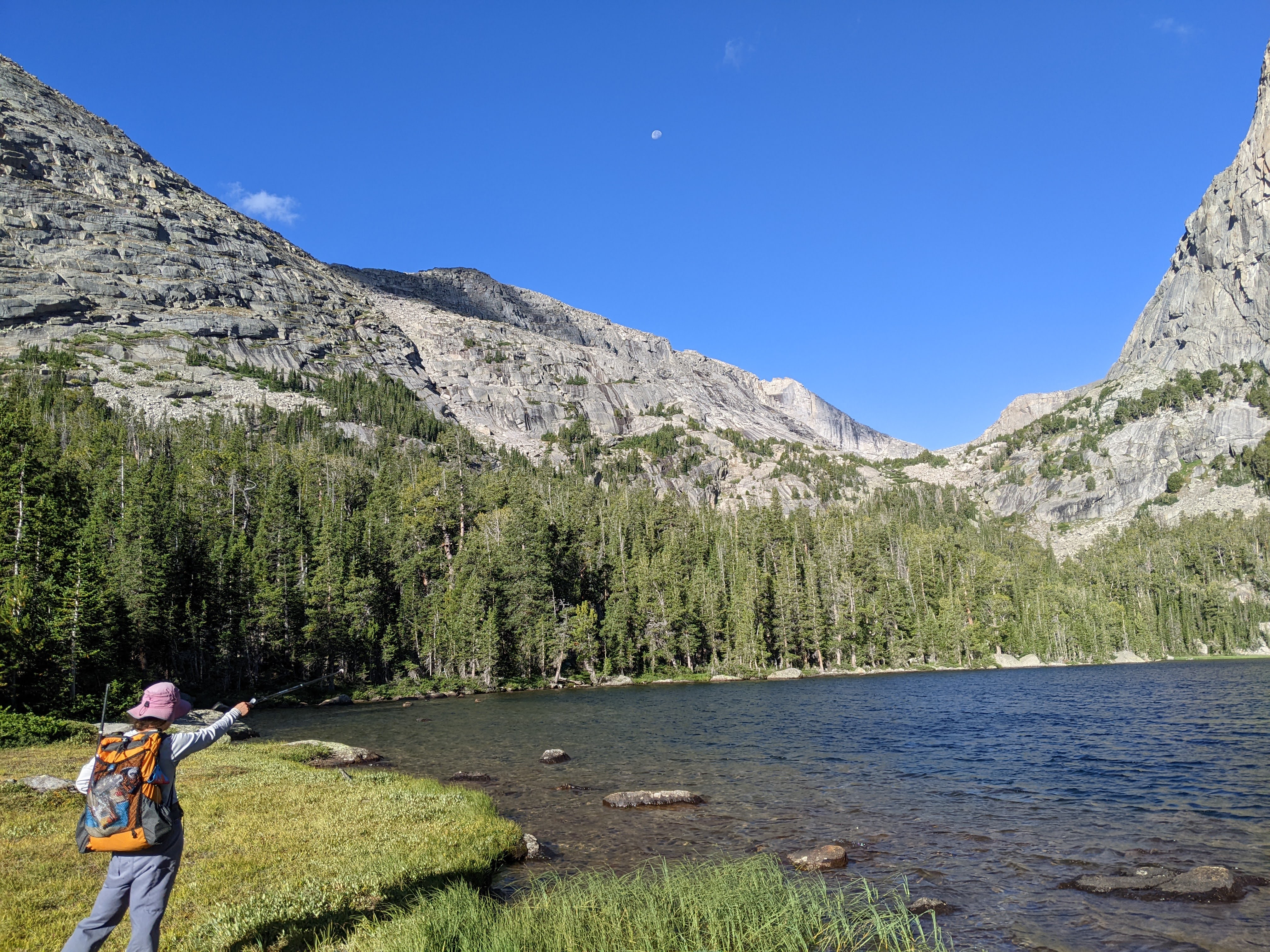 Once again we woke early. The wind had howled all night and it had briefly rained but the sky was blue once the sun came up. After packing up camp and eating breakfast we regained the trail down to Lonesome Lake. There were definitely a couple big steps along the trail, although most of it was relatively easy. Then we started on the social trail along the north side of the lake. We’d had a good view of the route from the previous evening camp and knew we were heading for a small meadow that emerged from the lake with a few trails. This spot was on the cover of our map.