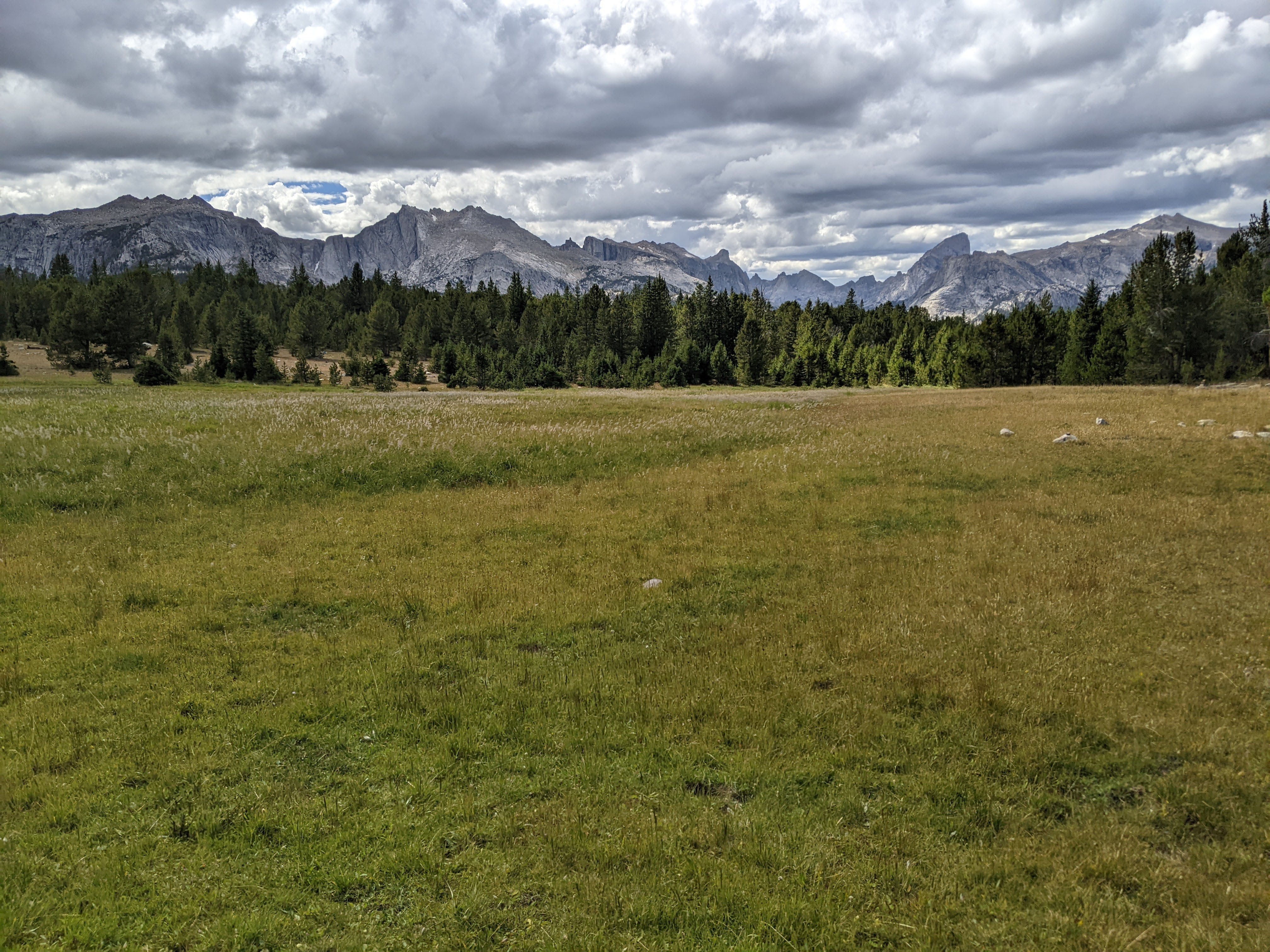 Then we descended. Overall it was an easy peak with mostly alpine sidewalk and almost no bouldering. In contrast, the route off the north side of Temple Pass was quad-busting steep. More loose gravel. Not terrible but not exactly enjoyable either. It was sunny when we got down to Temple Lake and so we washed up in the lake which felt very good. From here we continued down to Big Sandy Lake. We caught some views looking back to East Temple and the meadow above Miller and Rapid Lakes had more stunning scenery.