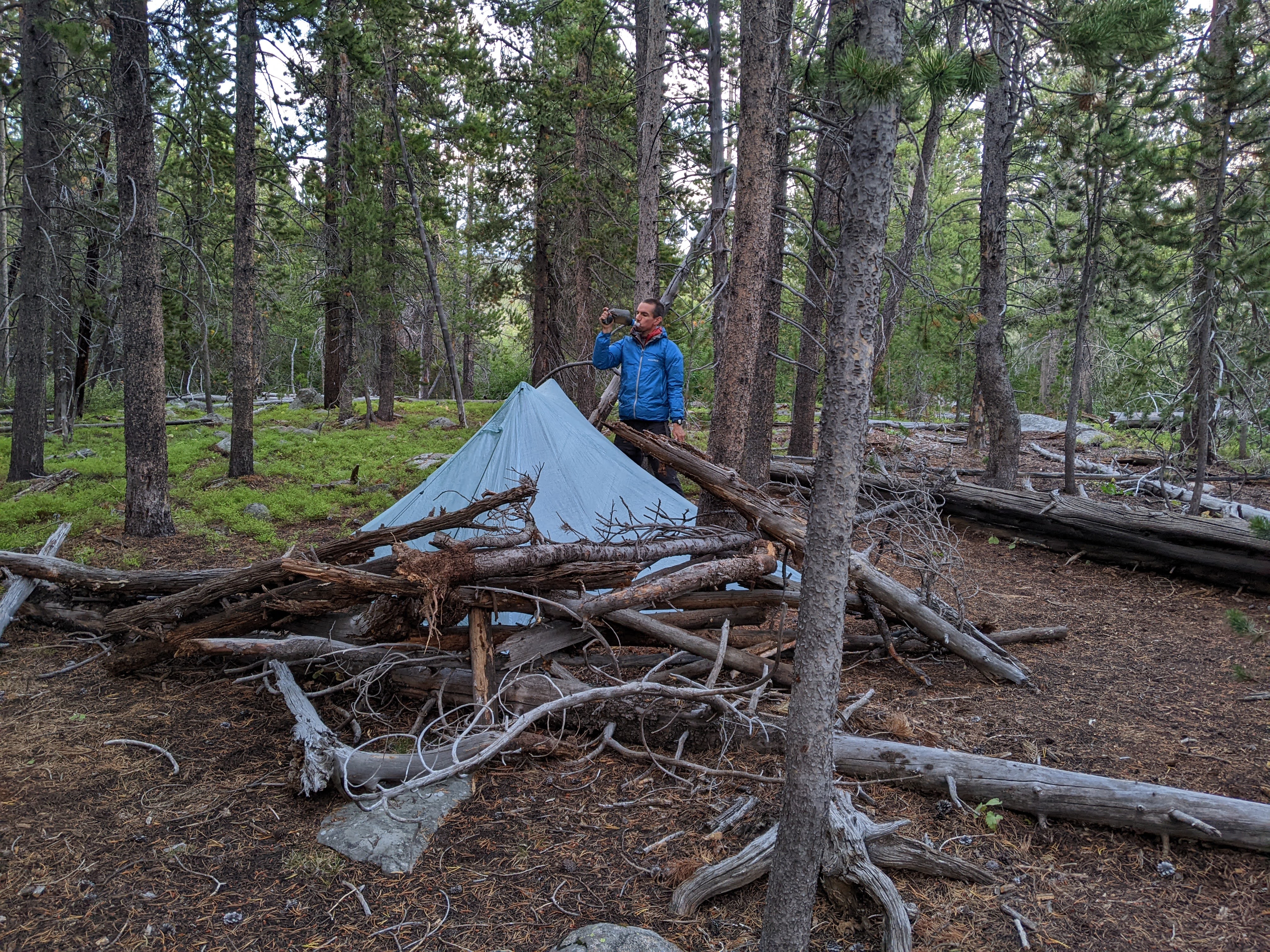Once down at Three Forks Park we started looking for a place to camp. This had felt like our longest day and I wanted a site not too far off the trail with easy water access. It wasn’t too long before we found an area between the trail and creek that was quite close to the latter. The wind was still blasting. We didn’t feel so much as hear it rustling the trees. It was so loud it drown out the sound of the creek.