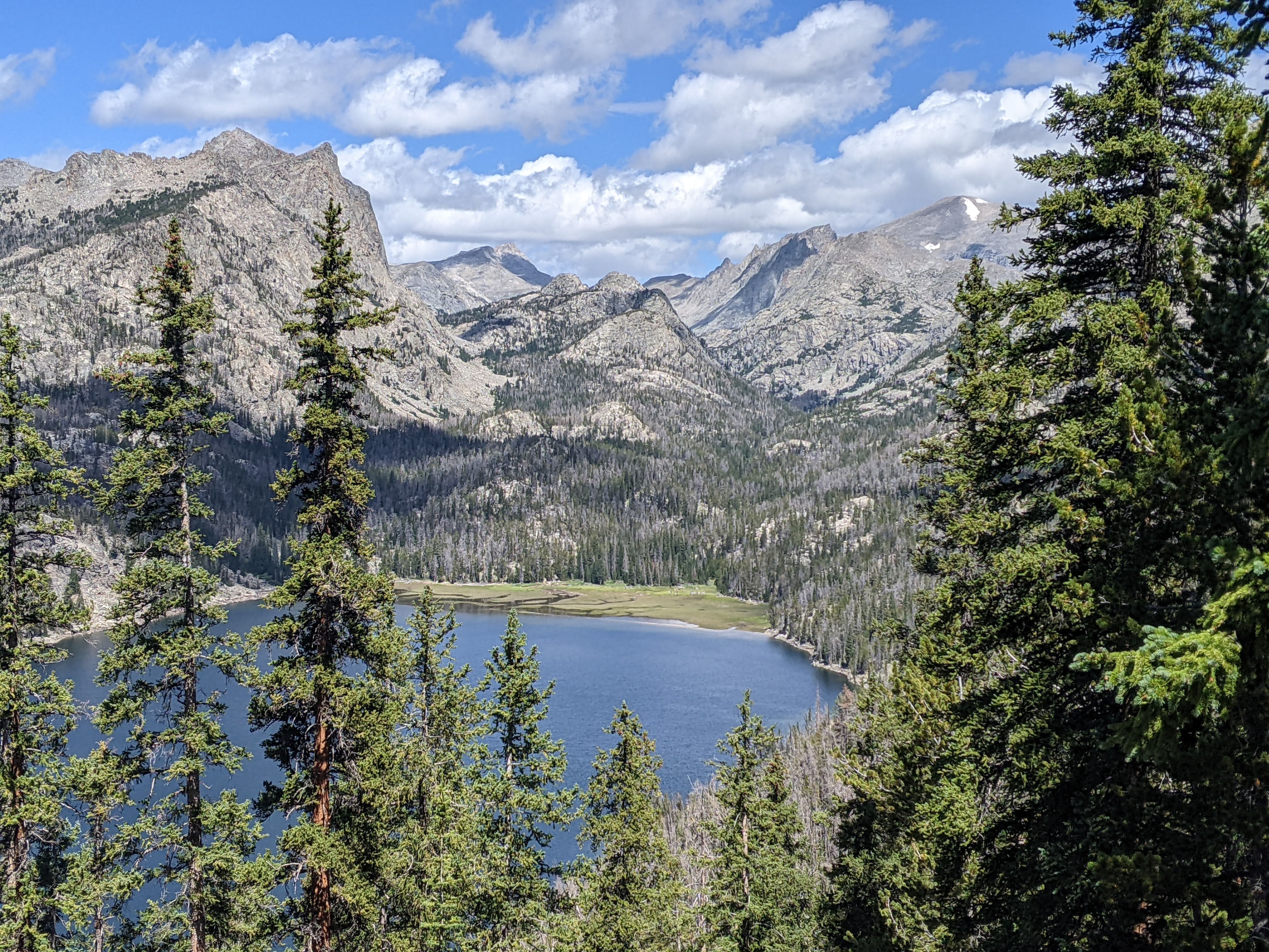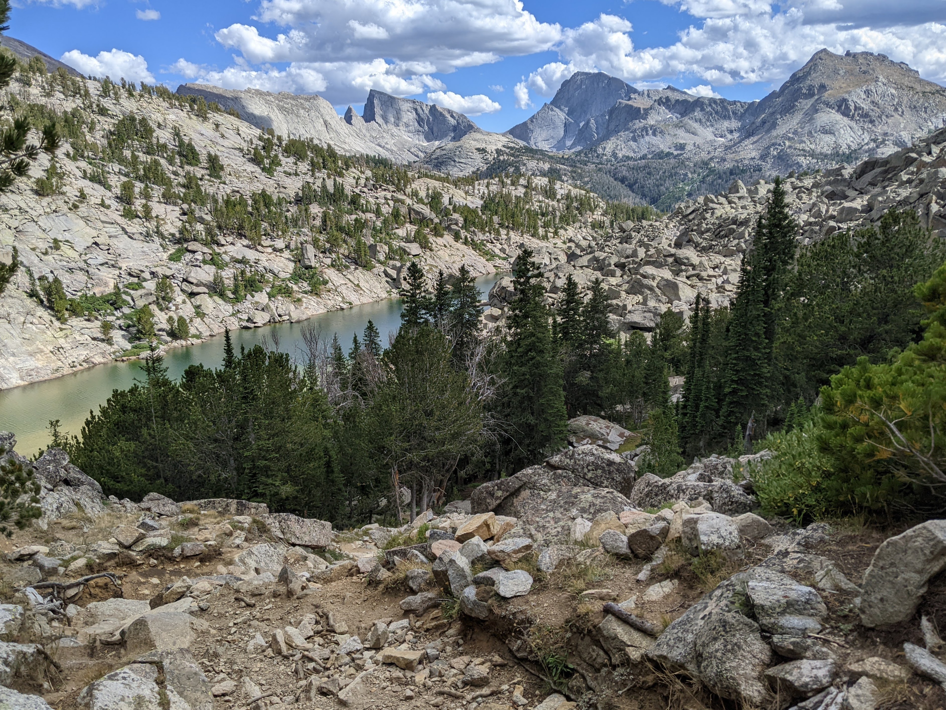 The pass was all in the trees. We crossed a boulderfield on the way down where we finally had a look at Little Sandy Lake along with Wind River Peak and East Temple Peak. Following the initial descent, then a creek crossing, and a bit of climbing, we came to a slightly exposed ridge. Here there’s a social trail, and a much more exciting variant of the CDT that heads steeply down to Little Sandy Lake. We were mostly able to follow cairns down which led us across an old dam. After filling up on water and eating second lunch, we got back on the social trail which initially was quite difficult to follow. As we climbed towards the lake at 9,800 feet, we briefly followed a couple with three dogs and then met a series of CDT south-bounders who all made it easier stay on trail.