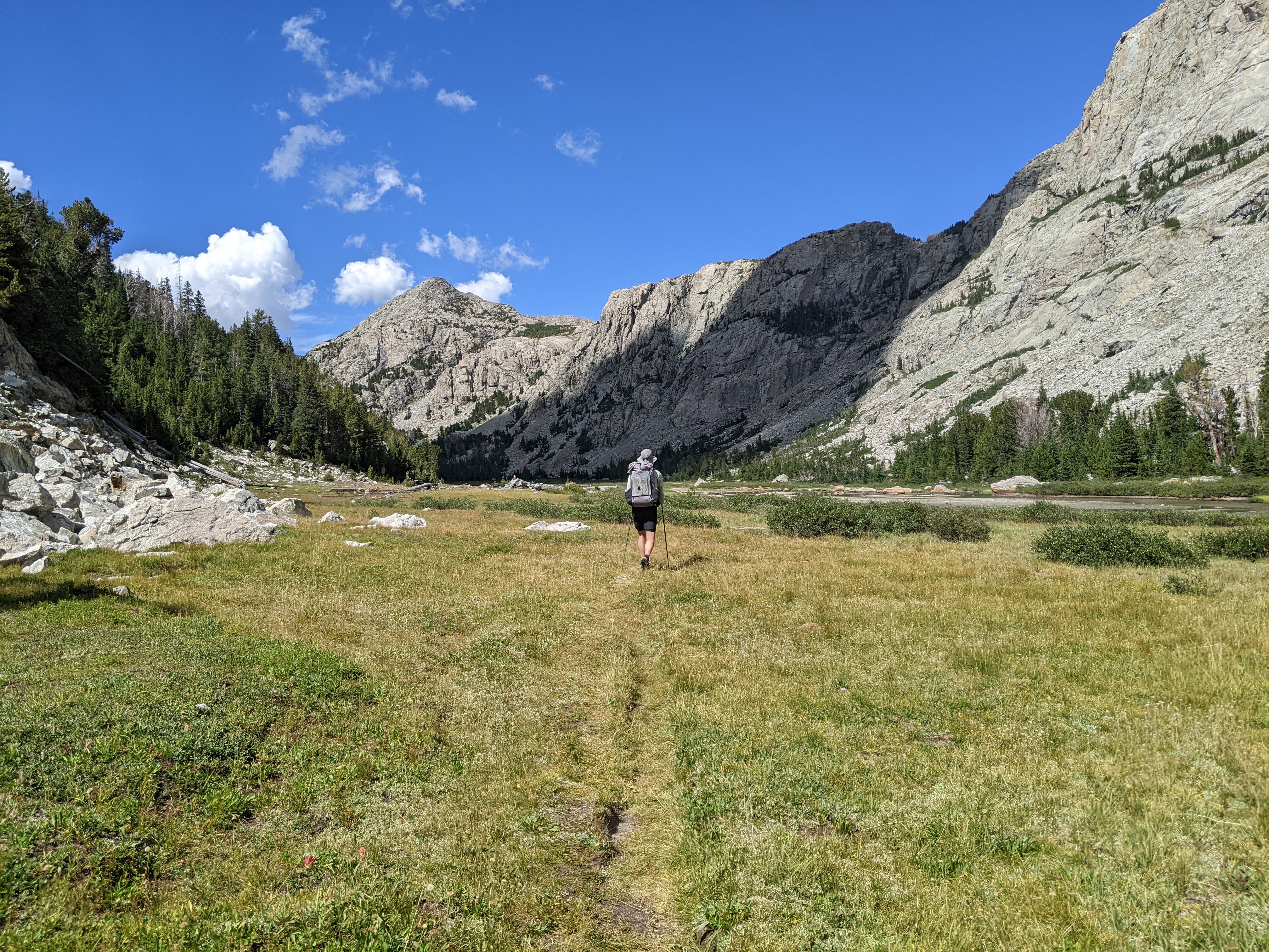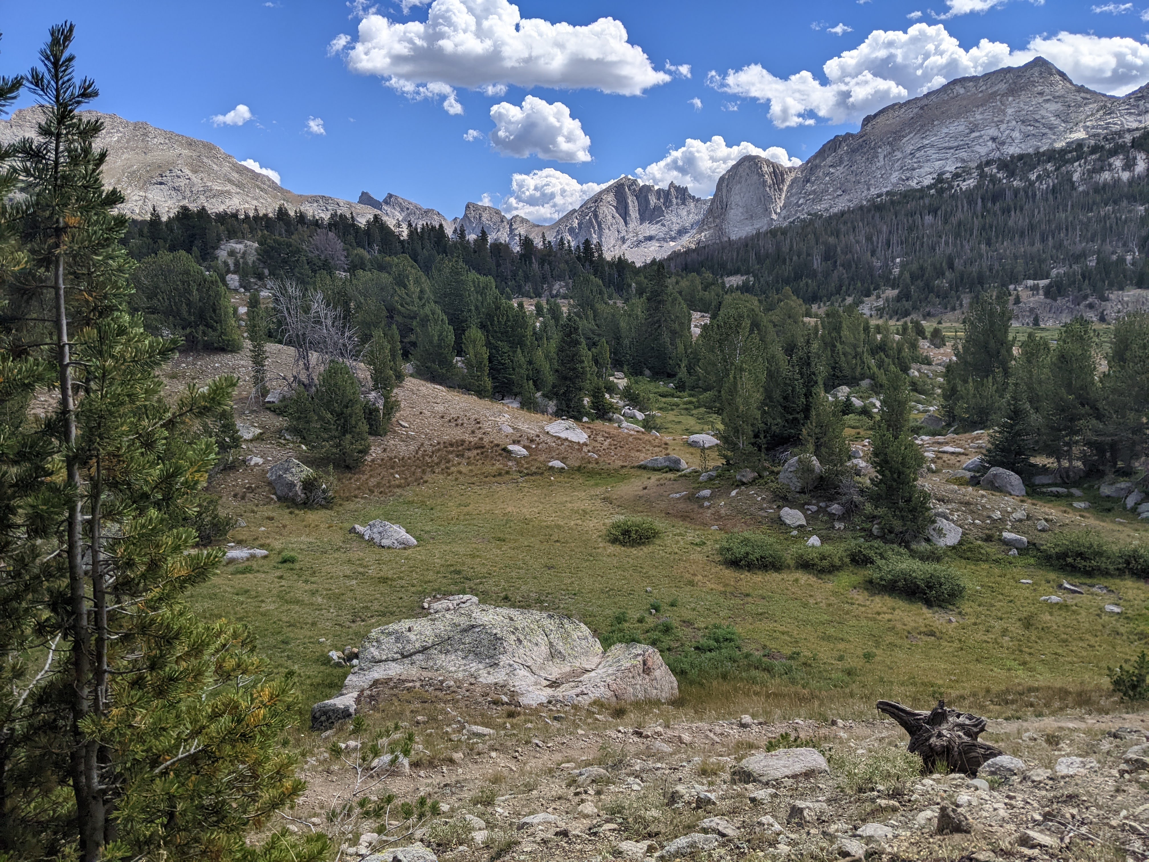 Now the trail was largely in the forest. We had to stop and wait for a big horse train that kicked up quite the dust. The views were mostly nonexistant. We crossed Smith Lake Creek again in a meadow. I wanted to keep my feet dry and so spent some time straddling a giant rock before finagling my foot onto a much smaller rock. We climbed up and then down and then up again before we finally came out along the dusty, wide, and mostly easy cruising trail that heads up alongside the North Fork of the Popo Agie River.