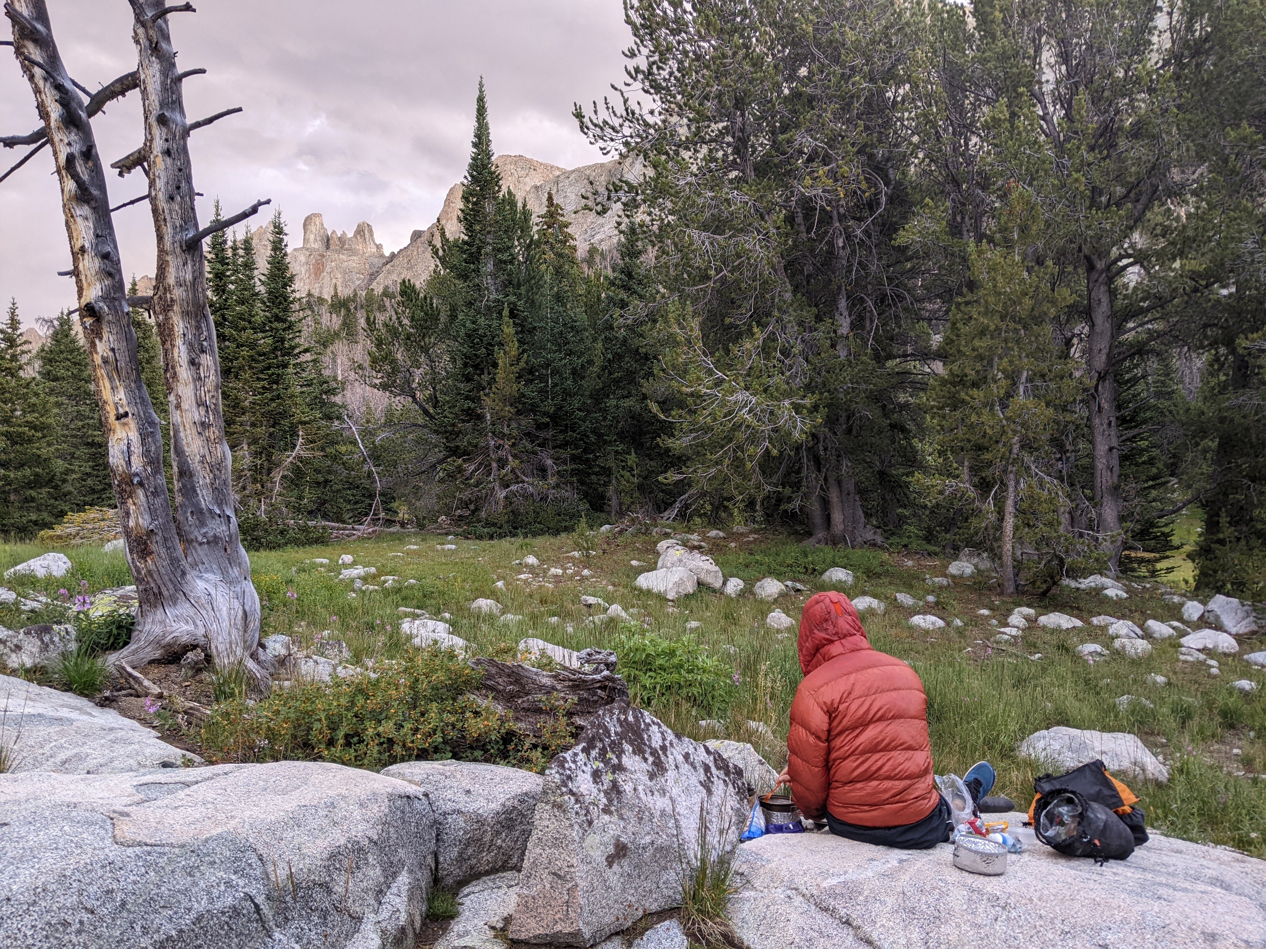 By the time we crossed the Little Sweetwater River it was nearing 6 pm and we stopped for dinner. Erik wanted to camp here but I suggested we push on for another hour or so to get a bit farther. I won out and so after dinner we kept going, having filled up on enough water (we had the capacity to carry three liters) to dry camp. Now it was cloudy but not exactly threatening rain. We crossed paths with more south-bounders and then as we neared a ridge, Erik began in earnest to find us a place to camp. We got a good site, albeit it wasn’t quite flat. I should note here that there are no designated campsites in the Wind River Range.