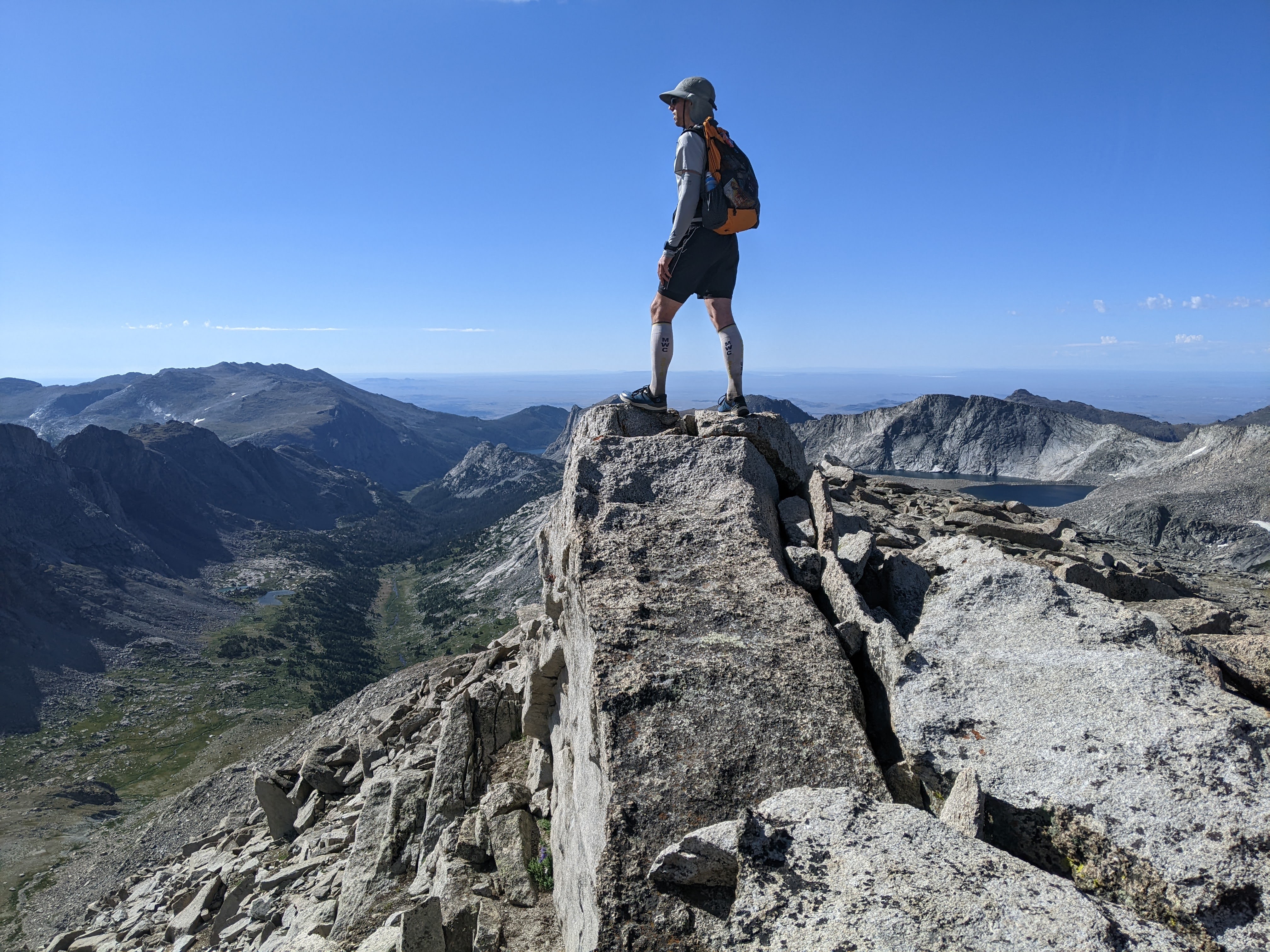 After realizing it was a false summit we made our way north to the real summit. It was a bit hard to determine where the real summit was but it was an upside down V formation of two rocks. There were a couple other guys up there with us but otherwise we didn’t see anyone else. The view was of course, amazing. I wasn’t quite prepared to be able to see all the way to Gannett Peak and its associated disappointment from last year, but it’s east face is quite discernible with it’s large high glacier. I liked looking immediately down to the east where there was still a glacier-colored lake. We took our time on the summit, eating first lunch and taking in all the mountains around us.