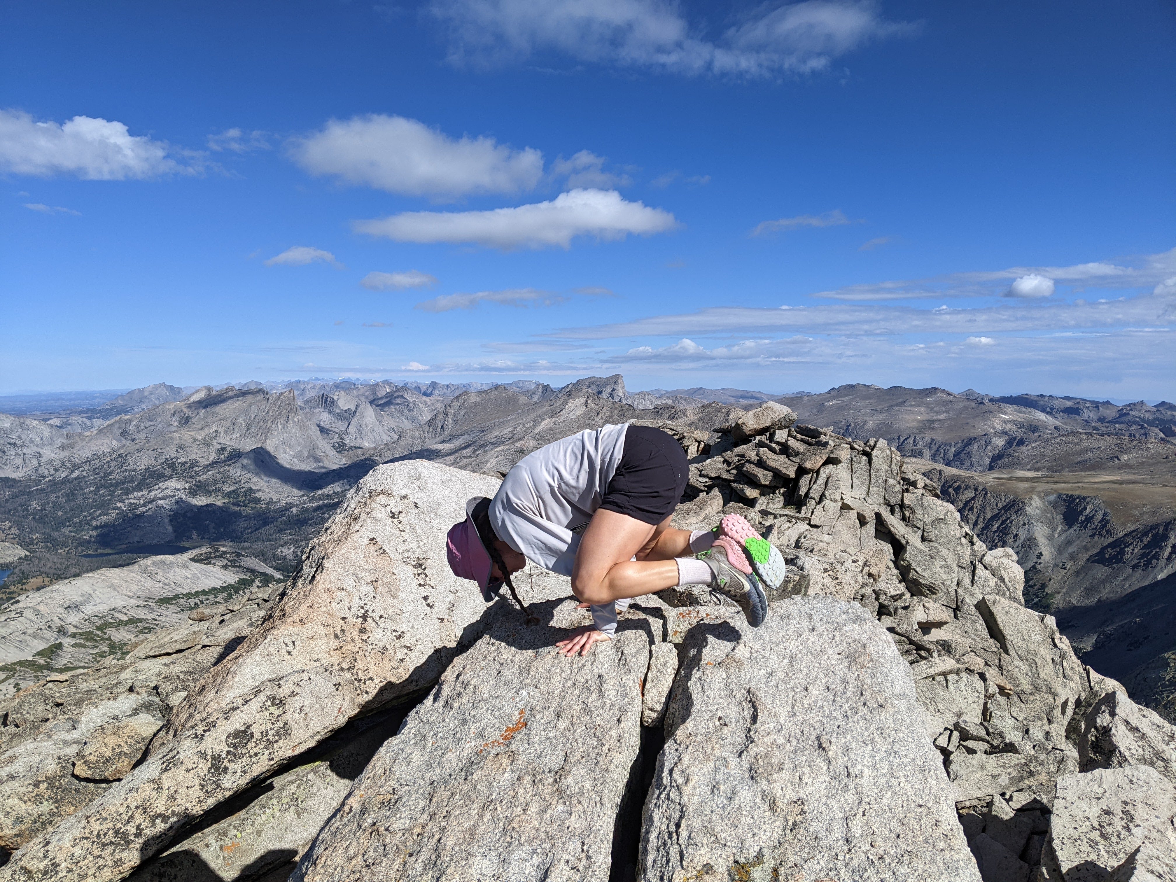 Me doing Crow Pose on those same rocks, all the high peaks of the Winds behind me. Even all the way to Gannett.