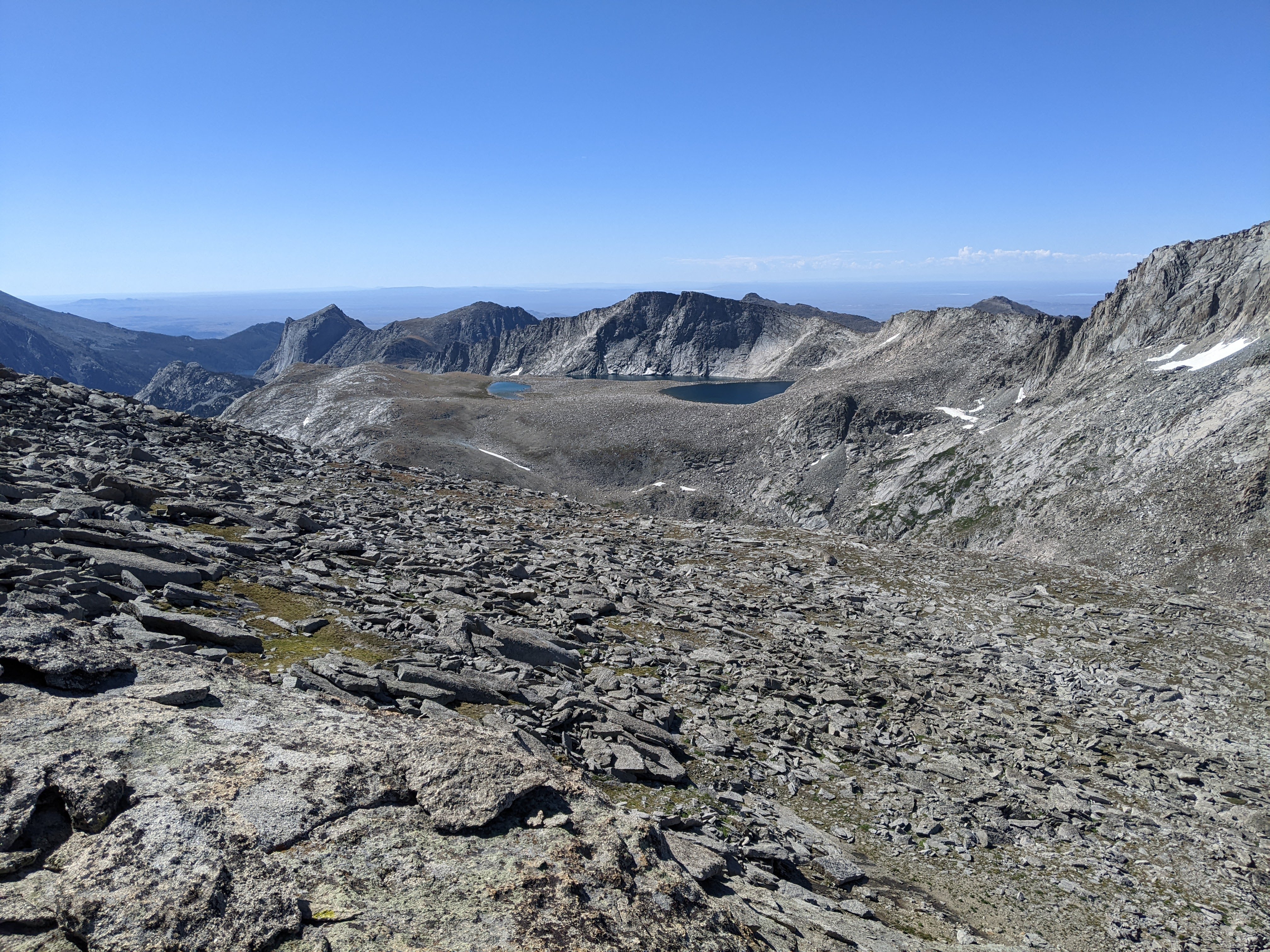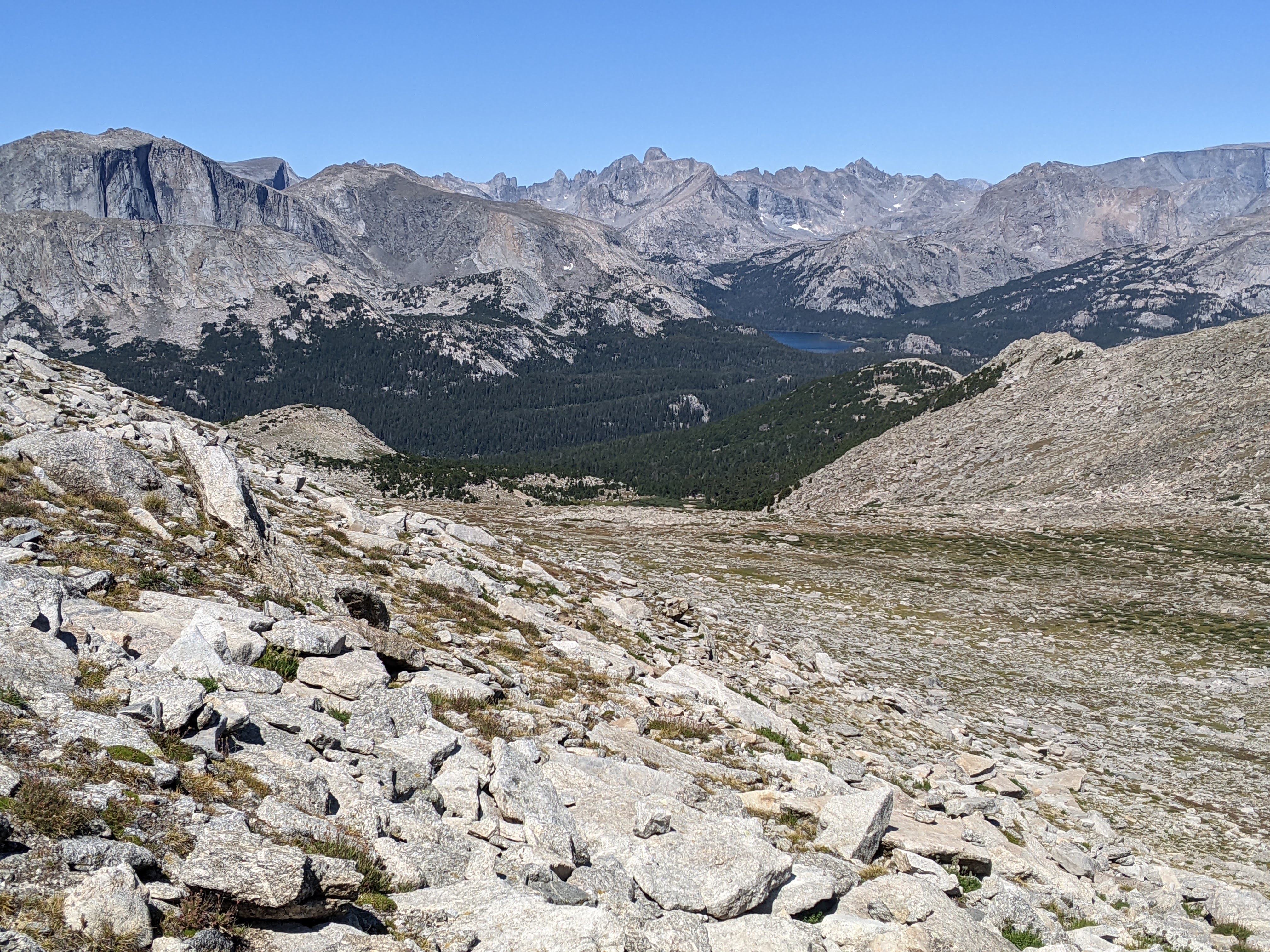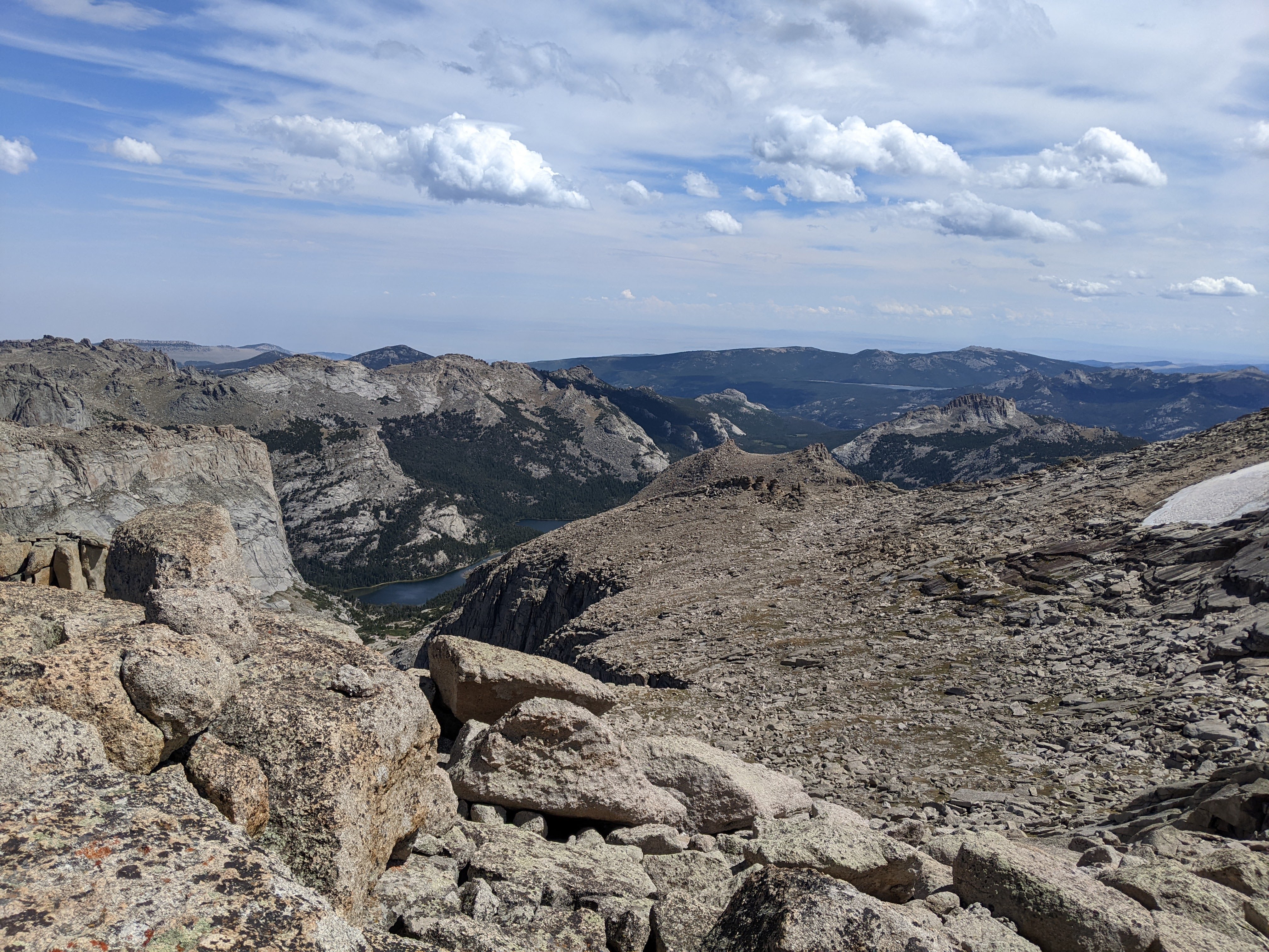 It wasn’t too windy on top and we lingered over second lunch, taking in our route from the previous few days and looking north to the higher peaks, including Gannett. I saw Shoshone Lake to our east. I was glad the weather was holding and that we had time to just enjoy where we were.
