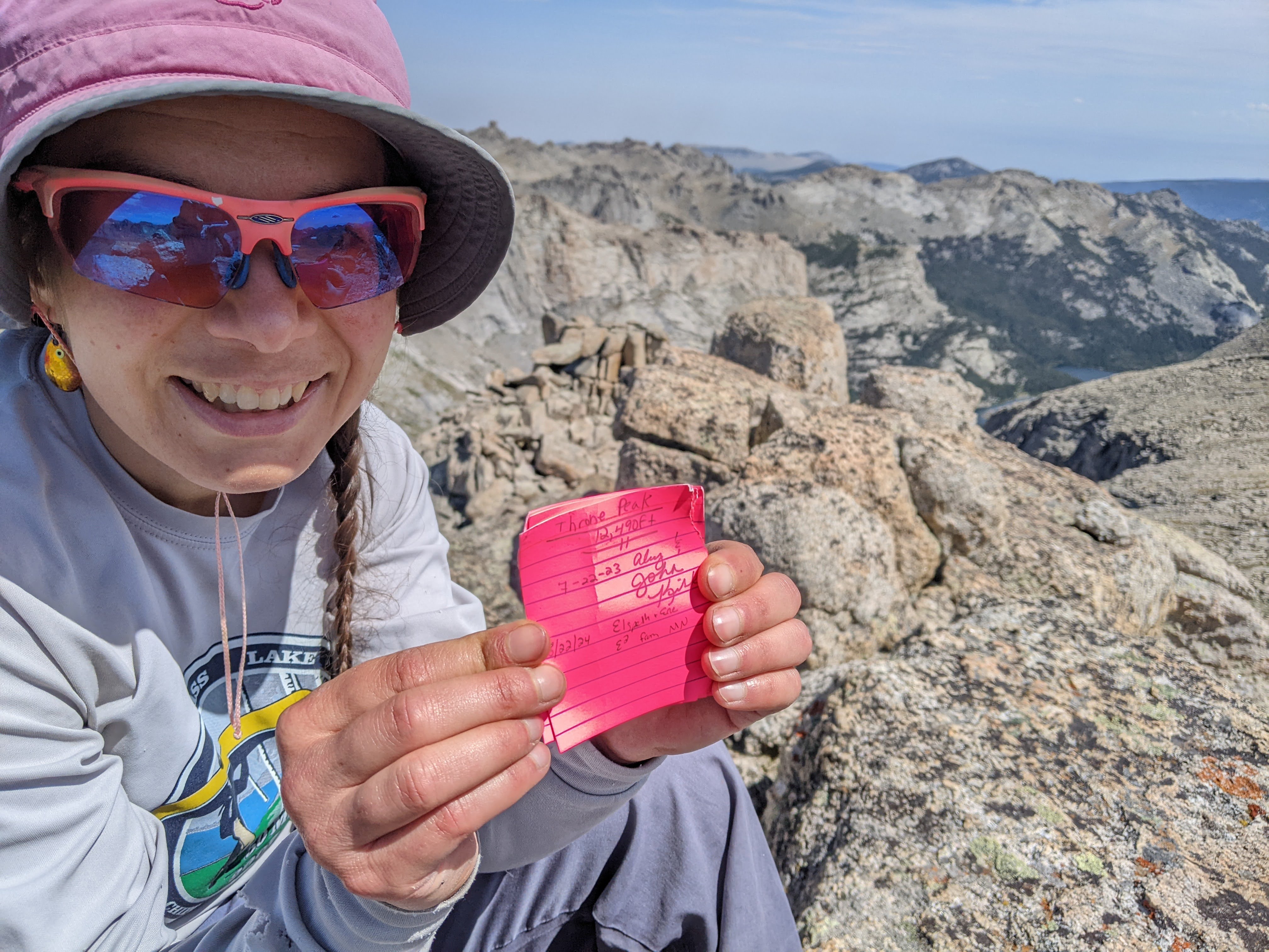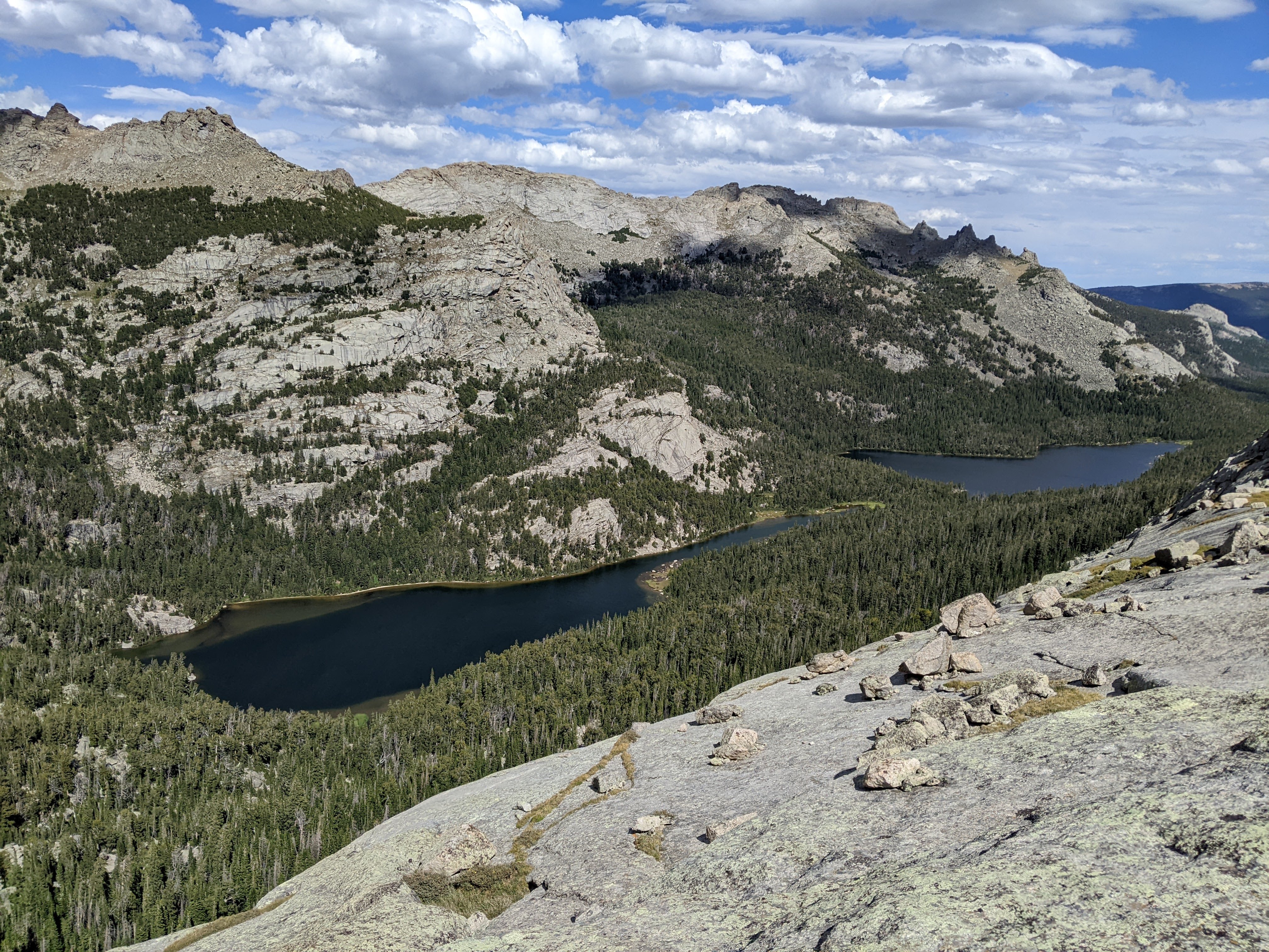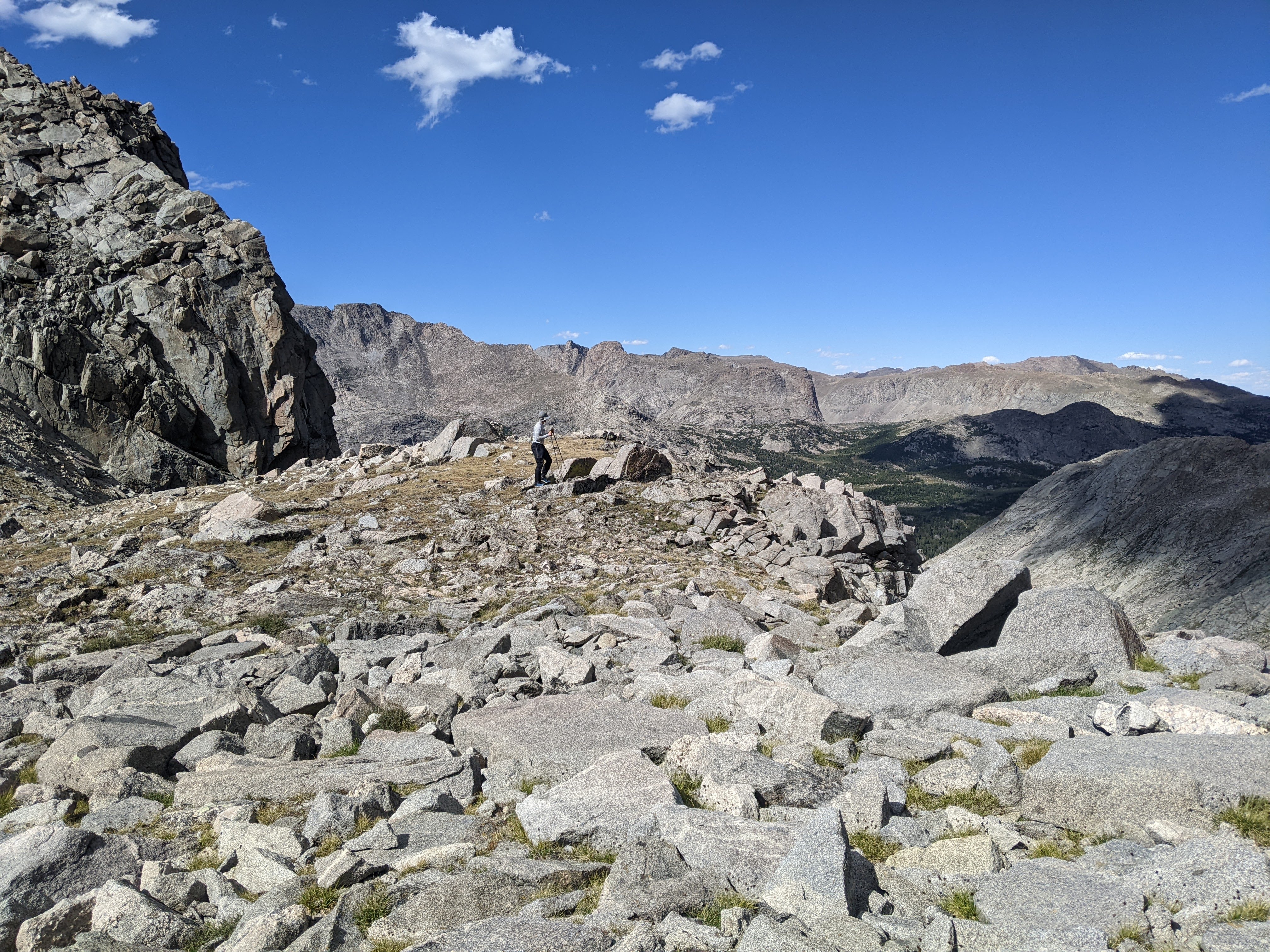 It wasn’t too windy on top and we lingered over second lunch, taking in our route from the previous few days and looking north to the higher peaks, including Gannett. I saw Shoshone Lake to our east. I was glad the weather was holding and that we had time to just enjoy where we were.