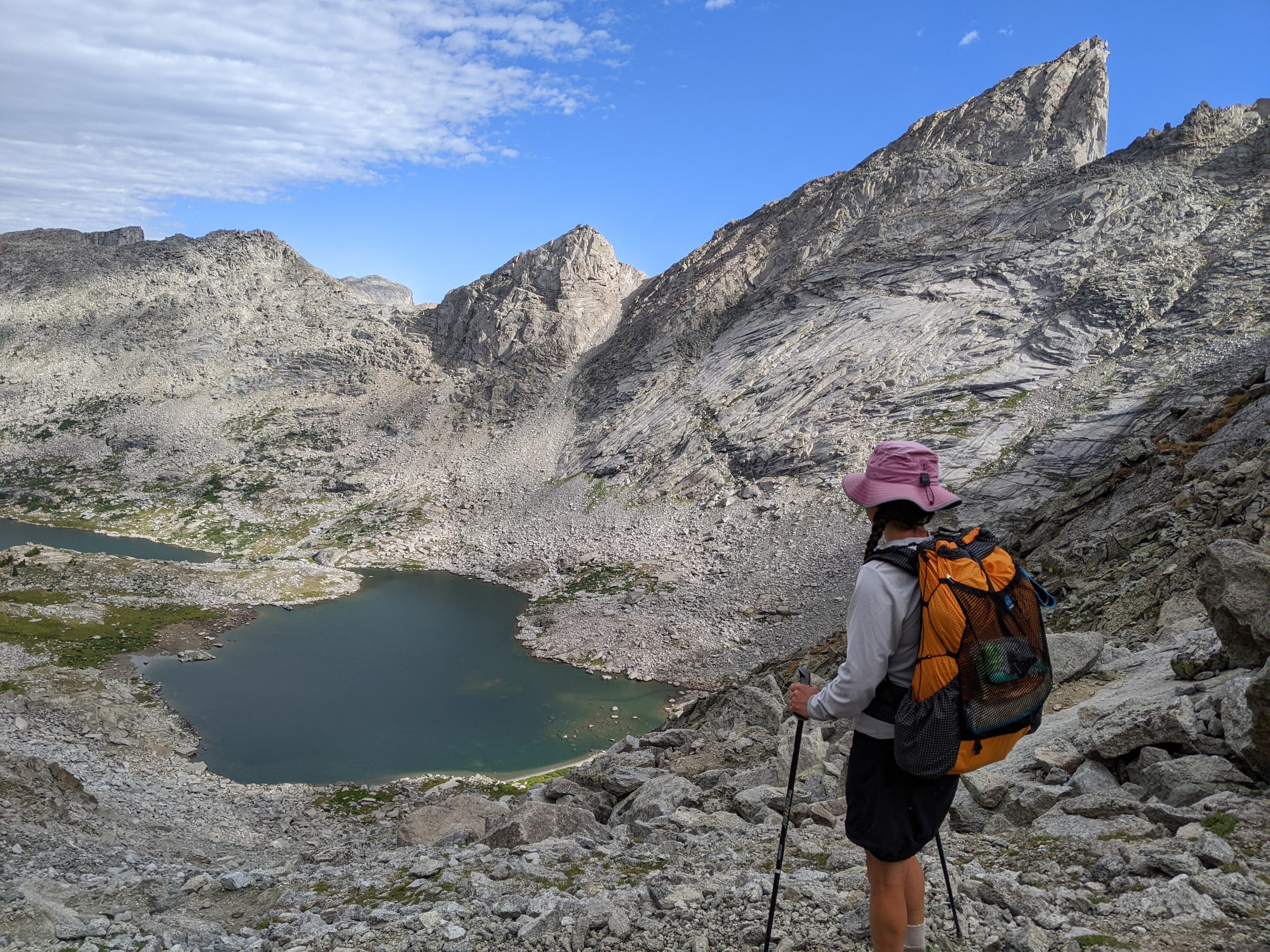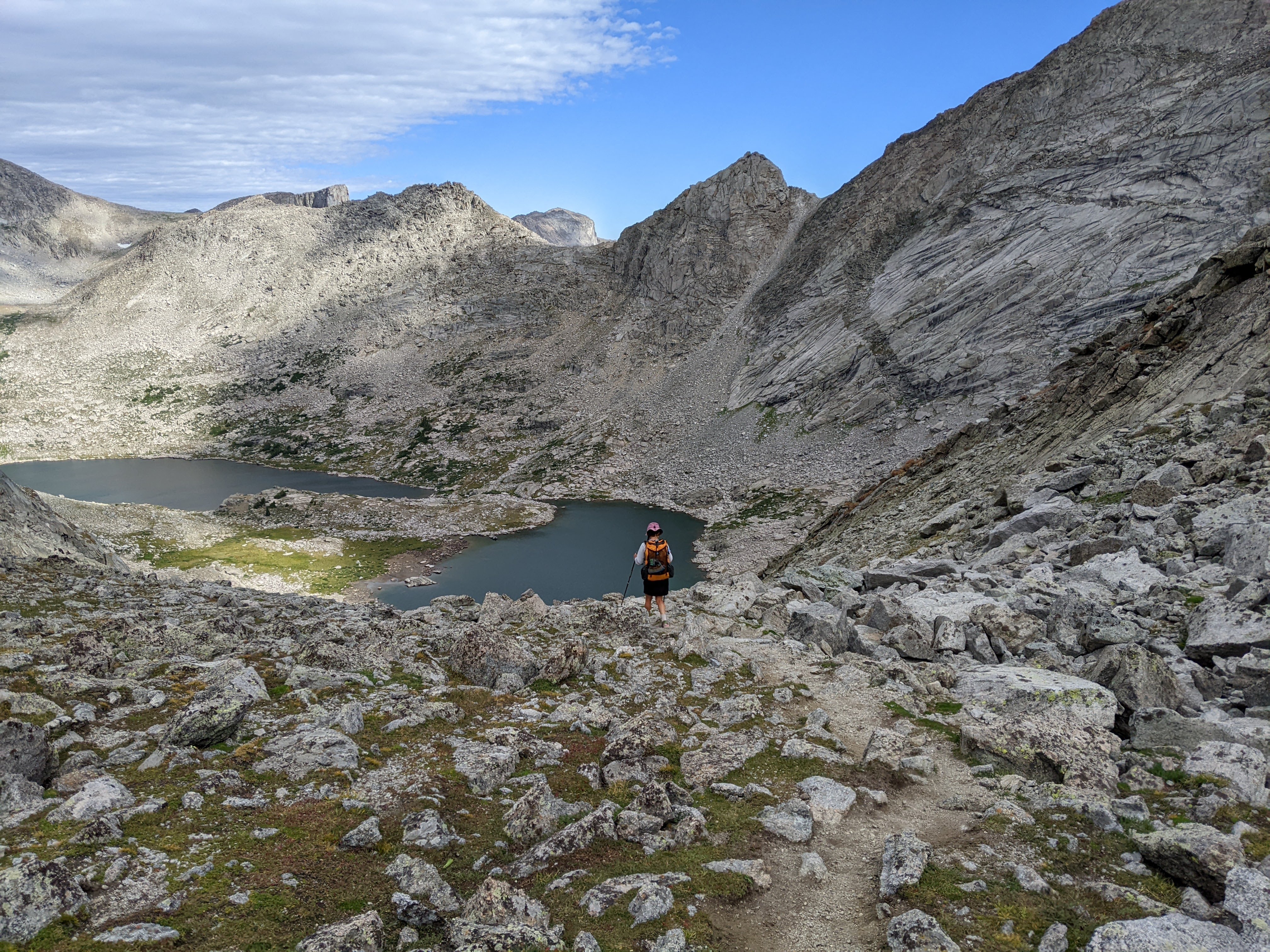 I was not expecting what happened next. Back in 2015 when we were here before, we’d hiked up to the north side of Texas Pass. We had a couple hours to kill from our campsite at Shadow Lake and I wanted to check it out. The pass looked a bit crazy and we had different route plans so we didn’t do it then. Zoom ahead to now, 2024. We began descending off the pass. There was an obvious trail that was again steep, often somewhat loose gravel. About half way down, we started encountering a lot of people heading up Texas Pass. There was a group of four, gallon jugs hanging off their packs. There was a couple with big backpacks. Another group of three. A through-hiker passed them all up. And more people kept coming up the trail. I was super surprised to see so many people on such a rugged trail, but then I remembered how steep the official trails are in Alaska’s Chugach State Park and realized perhaps I’m just Minnesota wimpy.
