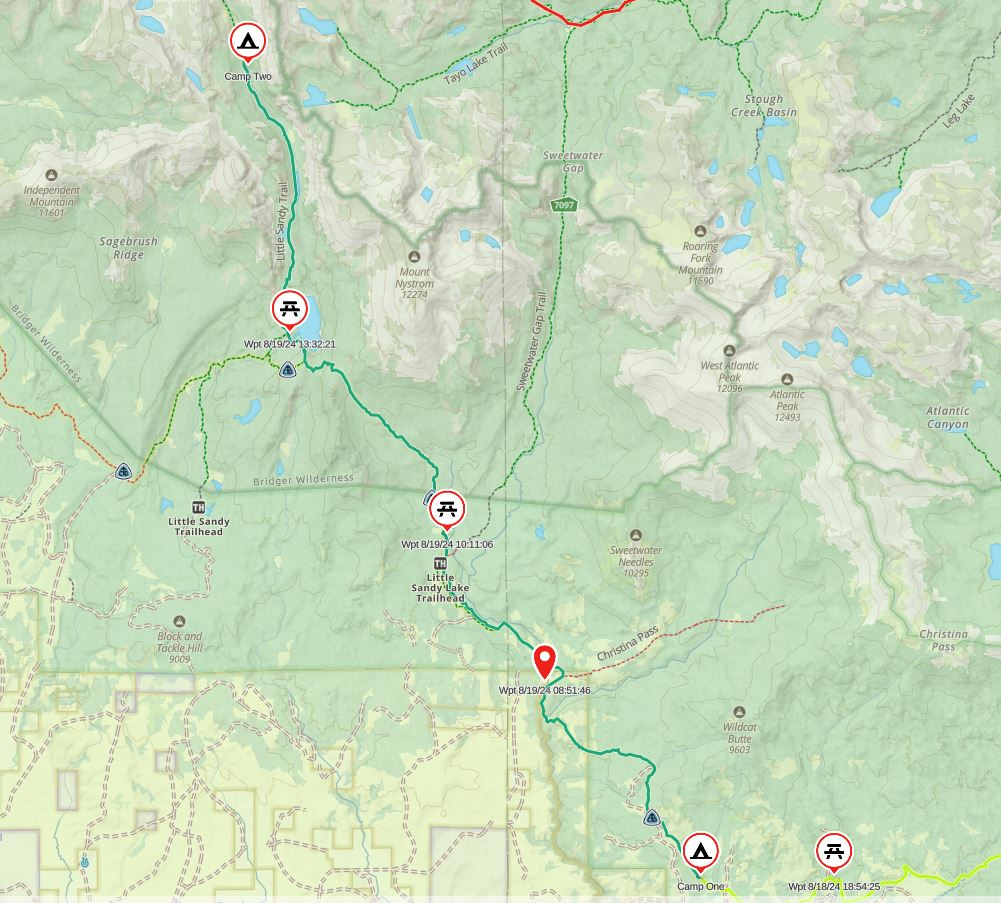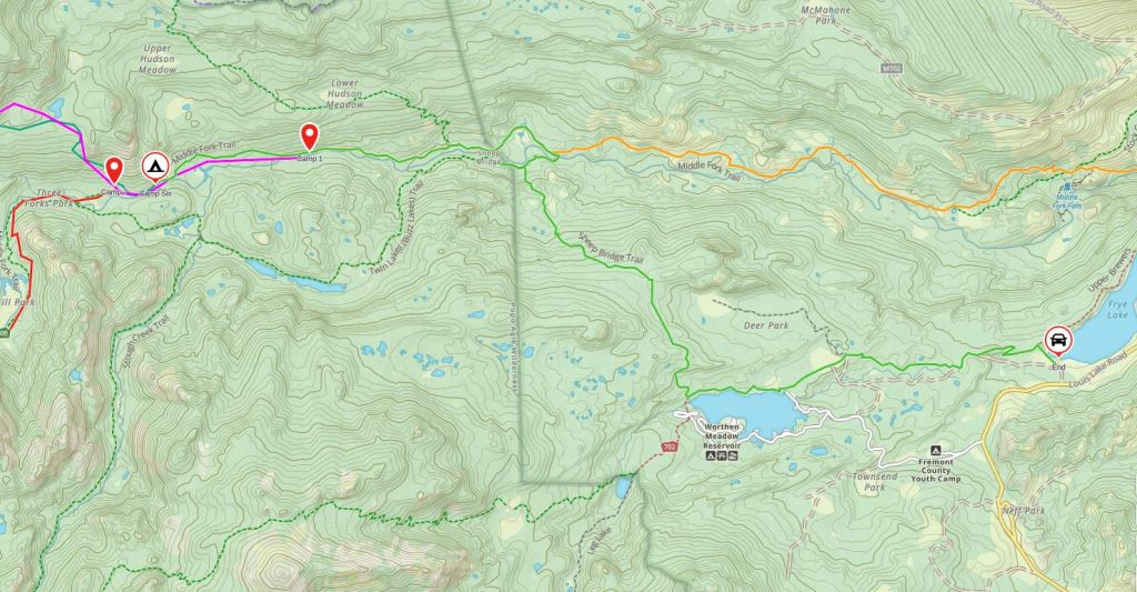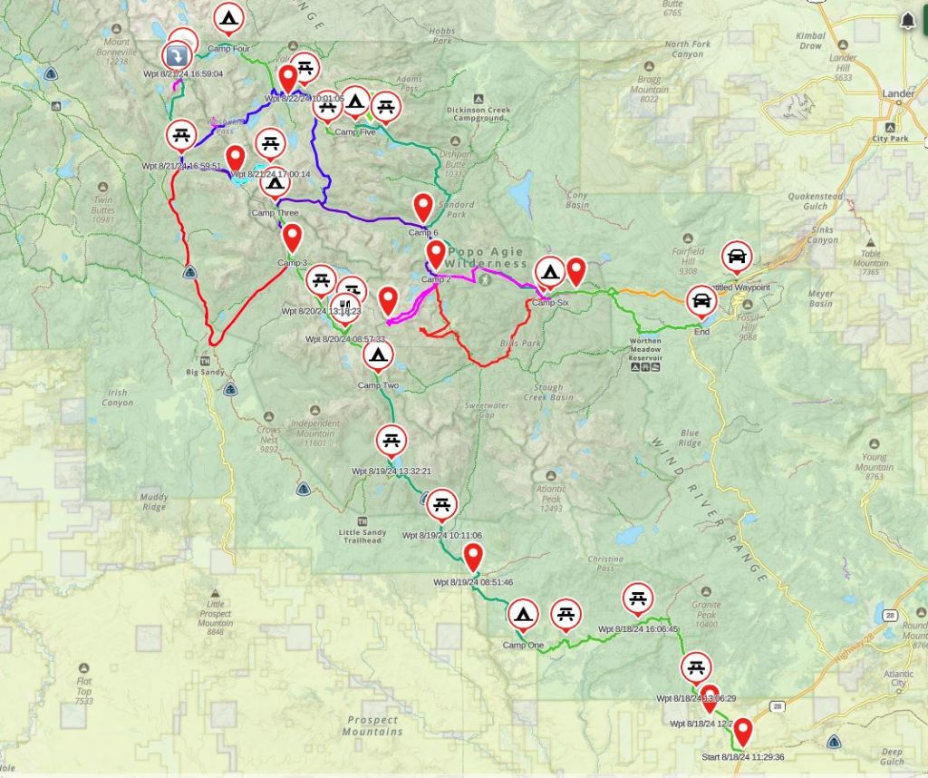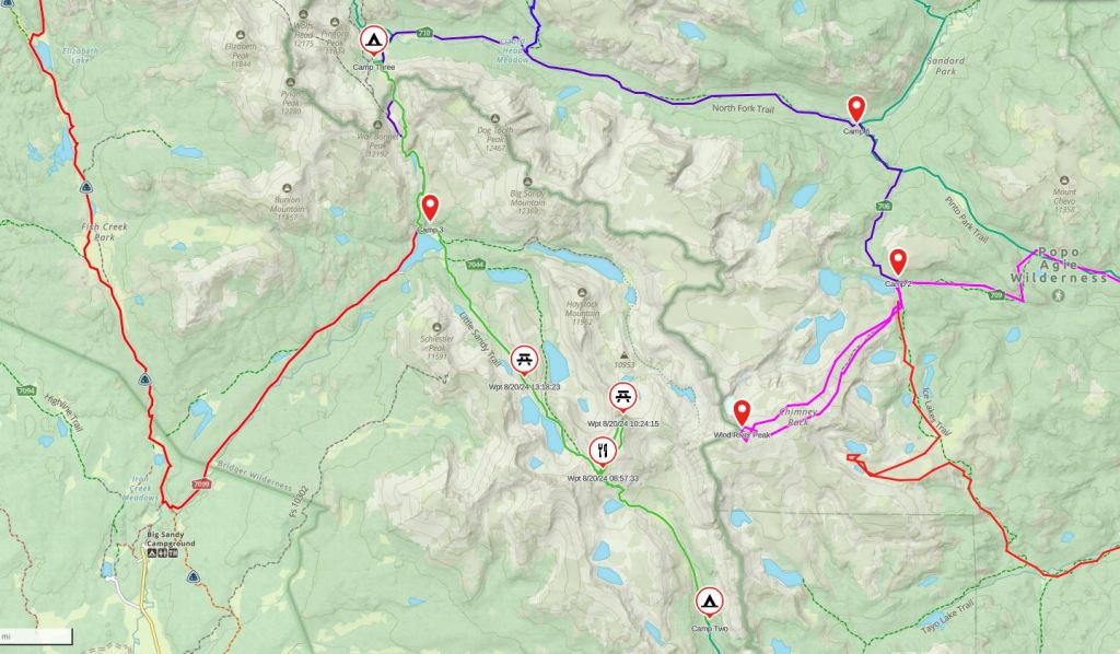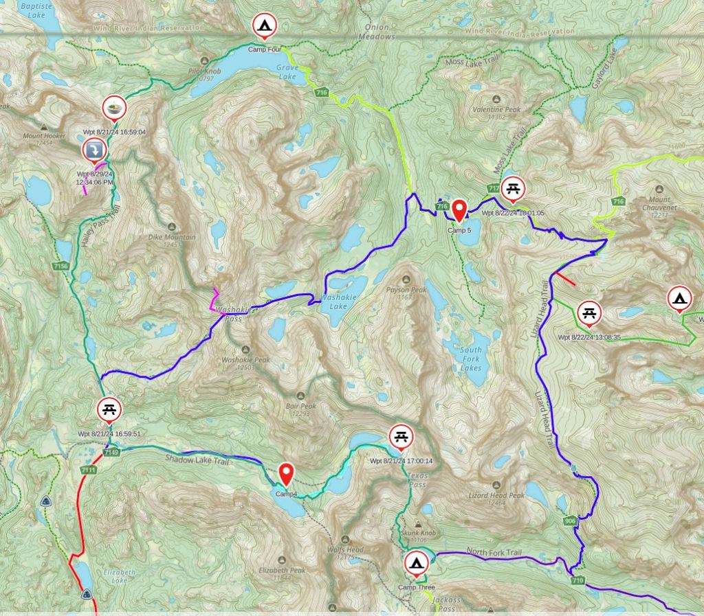 Our 90 mile point-to-point route of the south Winds in 2024; all in green (previous trip in other colors) starting with the lowest waypoint (noted as Start) and ending at Frye Lake at the car symbol, middle right. All camping spots for this year’s trip with the tent symbol.