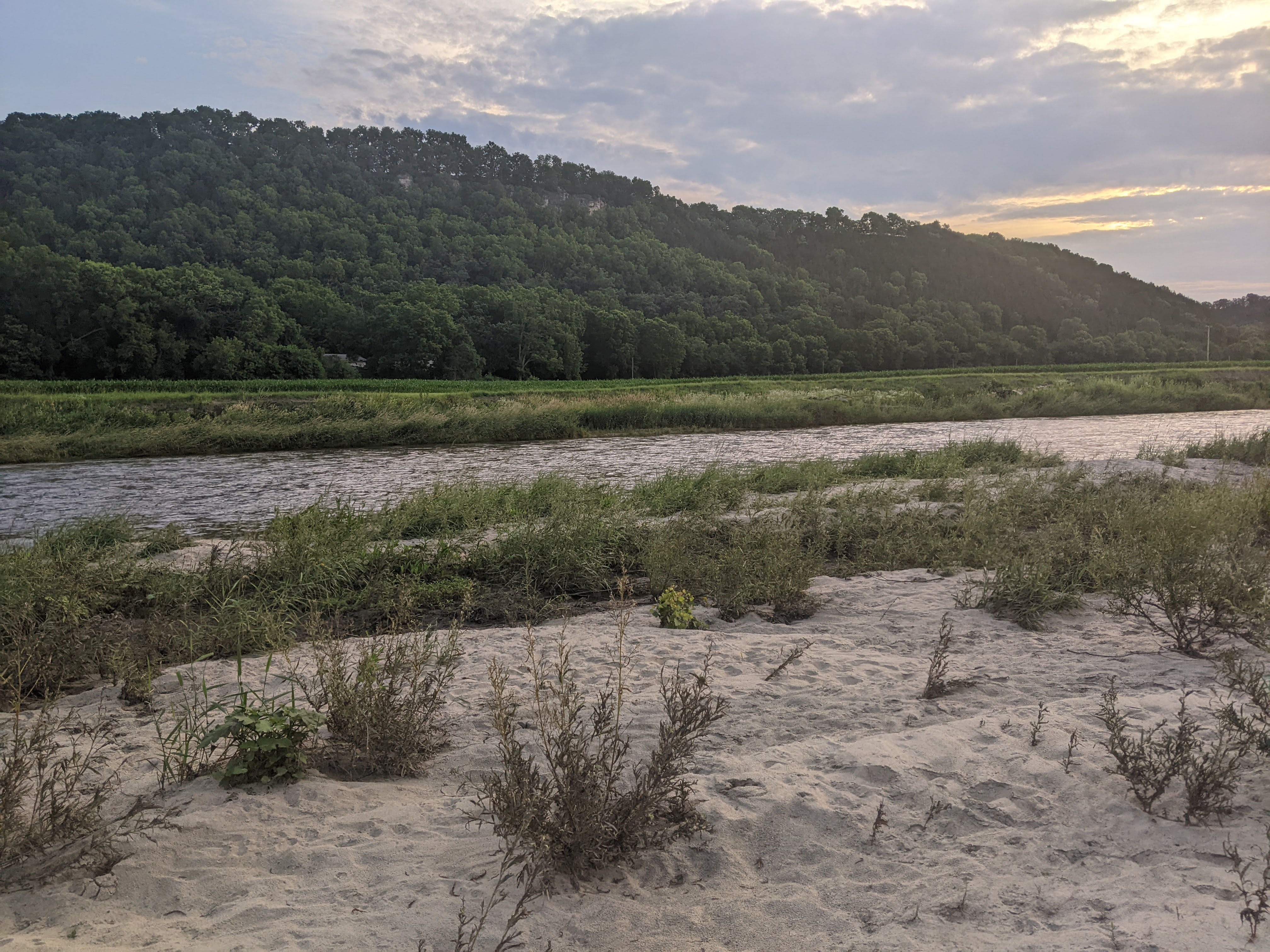 We were still cruising, making 6 mph, aiming for the Raaen Creek Campsites. Supposedly there were two. As we rounded the bend in the location of the campsites we saw a small trail leading into the woods. The landing wasn’t super easy and we had to paddle upstream to get back to it since the current was flowing well. I got out to scout and found quite the network of mowed trails but no designated camping areas. Eventually I walked downstream far enough to find a sandbar with some open area where I figured the bugs wouldn’t be so bad and it would be easier to land the canoe.