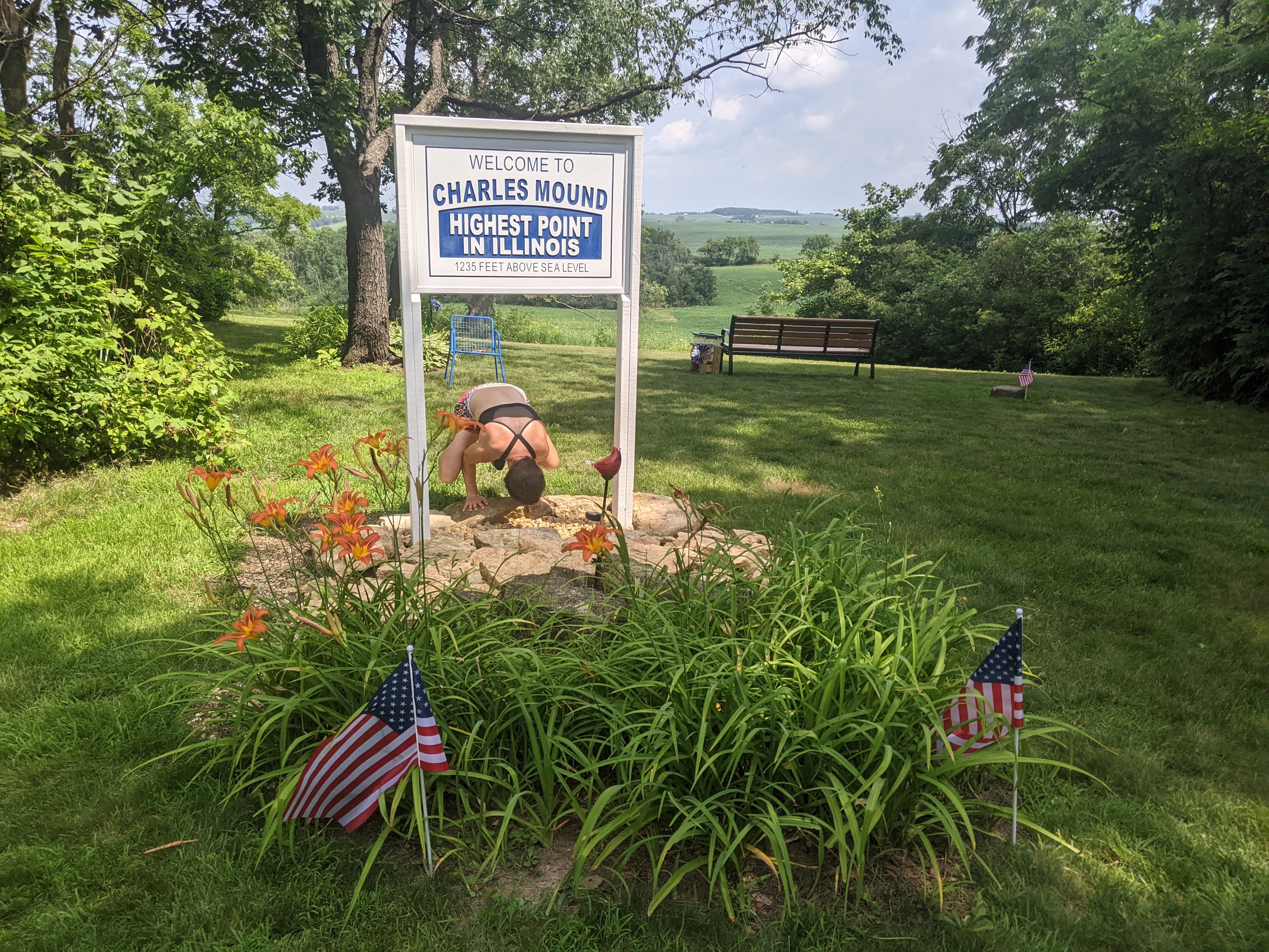 By the time I was ready to get up the next morning it was sunny and temps were already in the mid-70s. I had no motivation to go for a run and so instead we chowed down on continental breakfast and then drove 1.5 hours to the Illinois high point, Charles Mound, where we did a 2.5 mile out-and-back run with 250 feet of elevation to the top of Illinois.