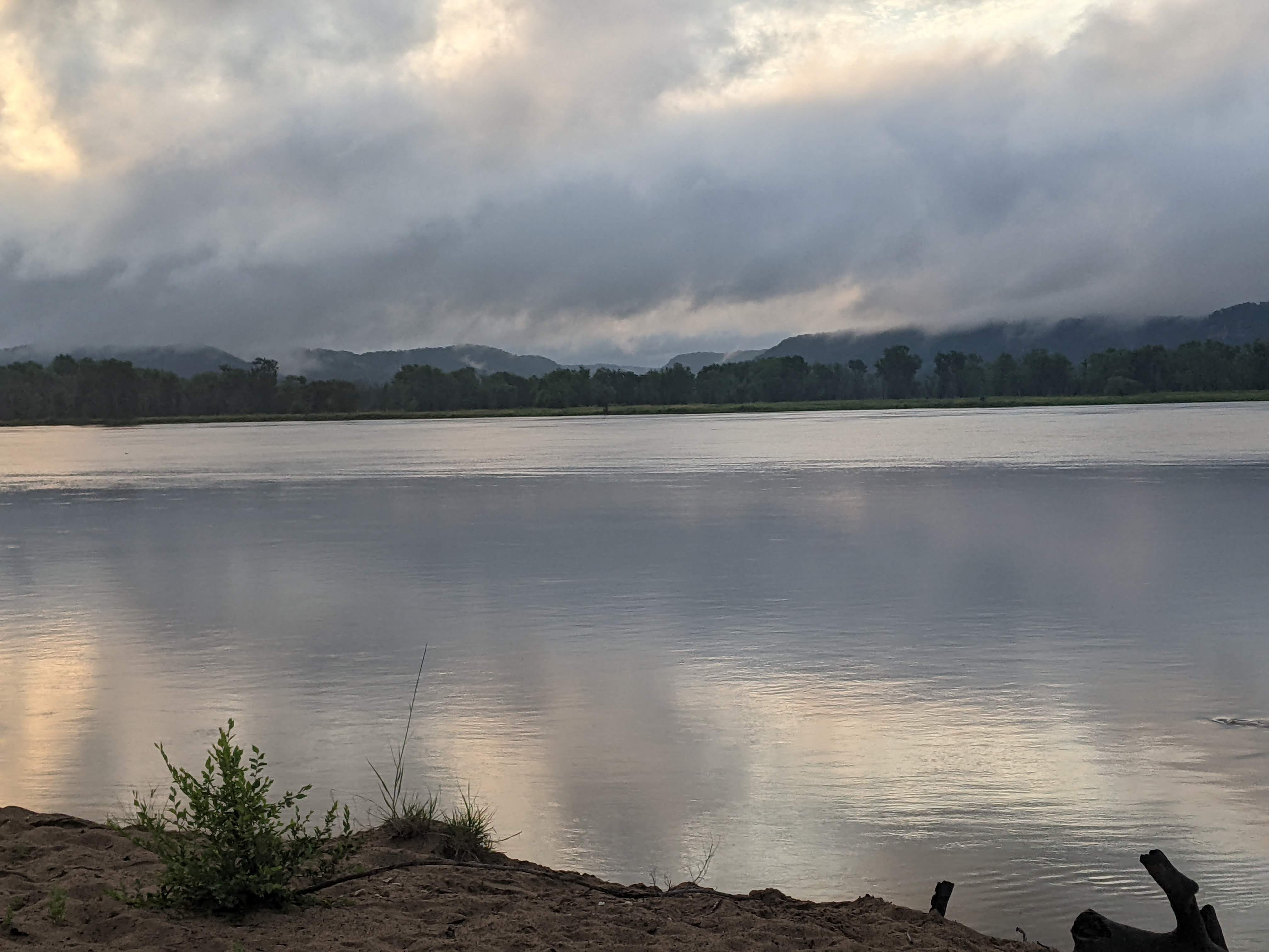 It was still warm and humid, like 80 degrees air temp by the time we were getting ready for bed so we cooled off in the river which helped some but not enough. Instead of our sleeping quilt we’d just brought a sheet but we didn’t need it for a couple hours. We woke early, the temp having only dropped down to the mid-70s and the humidity still thick. Sunrise was around 5:30 am and we had ate breakfast and packed up camp and were on the river by 6:20 am.
